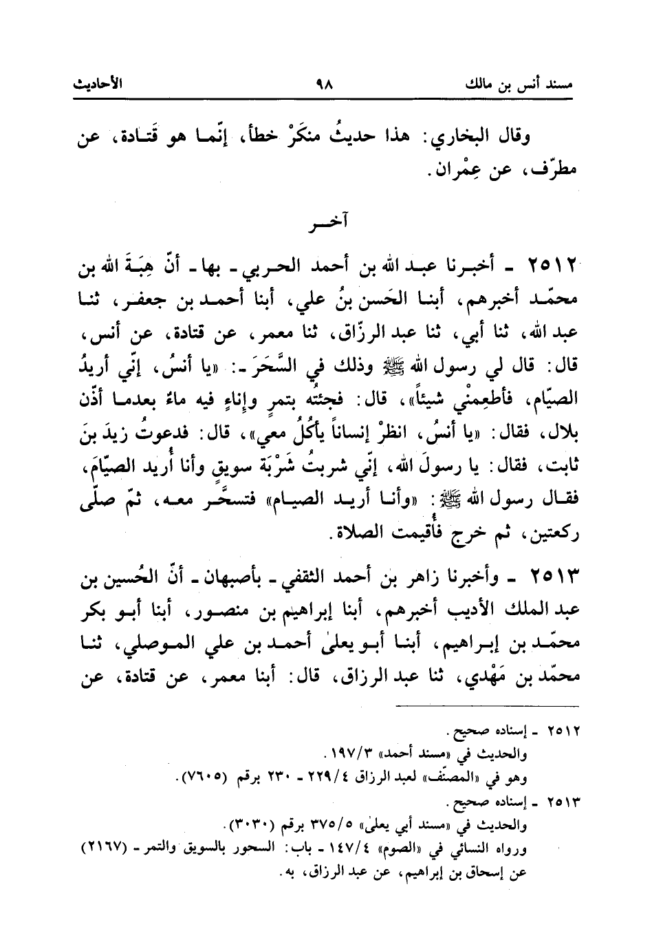 2512 - أَخْبَرَنَا عَبْدُ اللَّهِ بْنُ أَحْمَدَ الْحَرْبِيُّ بِهَا أَنَّ هِبَةَ اللَّهِ بْنَ مُحَمَّدٍ أَخْبَرَهُمْ أبنا الْحَسَنُ بْنُ عَلِيٍّ ابْنَا أَحْمَدَ بْنِ جَعْفَرٍ ثَنَا عَبْدُ اللَّهِ ثَنَا أَبِي ثَنَا عَبْدُ الرَّزَّاقِ ثَنَا مَعْمَرٌ عَنْ قَتَادَةَ عَنْ أَنَسٍ قَالَ قَالَ لِي رَسُولُ اللَّهِ صَلَّى اللَّه عَلَيْهِ وَسَلَّمَ وَذَلِكَ فِي السَّحَرِ يَا أَنَسُ إِنِّي أُرِيدُ الصِّيَامَ فَأَطْعِمْنِي شَيْئًا قَالَ فَجِئْتُهُ بِتَمْرٍ وَإِنَاءٍ فِيهِ مَاءٌ بَعْدَمَا أَذَّنَ بِلالٌ فَقَالَ يَا أَنَسُ انْظُرْ إِنْسَانًا يَأْكُلُ مَعِي قَالَ فَدَعَوْتُ زَيْدَ بْنَ ثَابِتٍ فَقَالَ يَا رَسُولَ اللَّهِ إِنِّي شَرِبْتُ شَرْبَةَ سَوِيقٍ وَأَنَا أُرِيدُ الصِّيَامَ فَقَالَ رَسُولُ اللَّهِ صَلَّى اللَّهُ عَلَيْهِ وَسَلَّمَ وَأَنَا أُرِيدُ الصِّيَامَ فَتَسَحَّرَ مَعَهُ ثُمّ صَلَّى رَكْعَتَيْنِ ثُمَّ خَرَجَ فَأُقِيمَتِ الصَّلاةُ إِسْنَاده صَحِيح