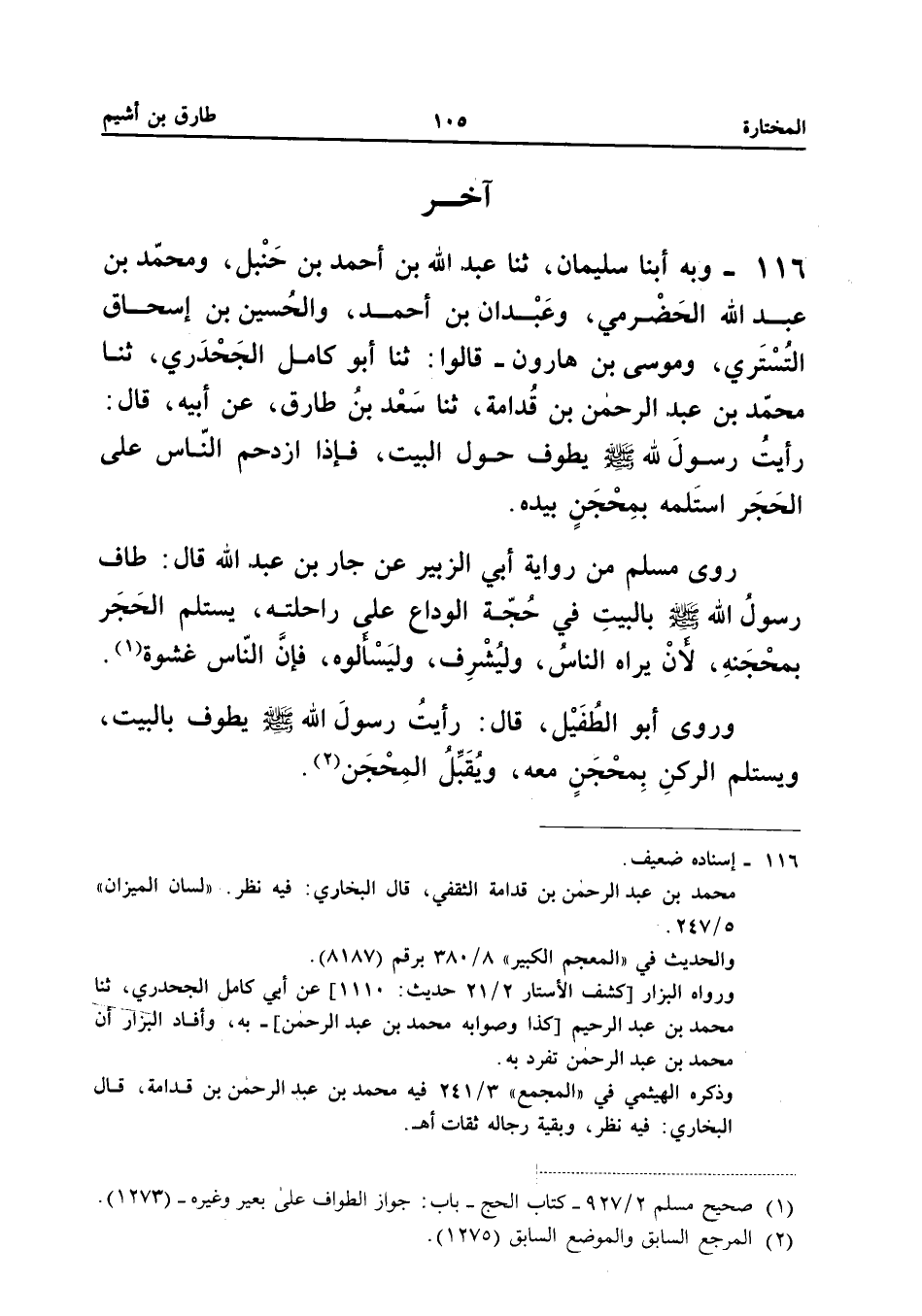 116 - وَبِه أبنا سُلَيْمَان ثَنَا عبد الله بن أَحْمد بن حَنْبَل وَمُحَمّد بن عبد الله الْحَضْرَمِيُّ وَعَبْدَانُ بْنُ أَحْمَدَ وَالْحُسَيْنُ بْنُ إِسْحَاقَ التُّسْتَرِيُّ وَمُوسَى بْنُ هَارُونَ قَالُوا ثَنَا أَبُو كَامِل الجحدري ثَنَا مُحَمَّد بن عبد الرَّحْمَن بْنِ قُدَامَةَ ثَنَا سَعْدُ بْنُ طَارِقٍ عَنْ أَبِيهِ قَالَ رَأَيْتُ رَسُولَ اللَّهِ صَلَّى اللَّهُ عَلَيْهِ وَسَلَّمَ يَطُوفُ حَوْلَ الْبَيْتِ فَإِذَا ازْدَحَمَ النَّاسُ عَلَى الْحَجَرِ اسْتَلَمَهُ بِمِحْجَنٍ بِيَدِهِ رَوَى مُسلم من رِوَايَة أبي الزبير عَن جَار بن عبد الله قَالَ طَافَ رَسُولُ اللَّهِ صَلَّى اللَّهُ عَلَيْهِ وَسَلَّمَ بِالْبَيْتِ فِي حَجَّةِ الْوَدَاعِ عَلَى رَاحِلَتِهِ يَسْتَلِمُ الْحَجَرَ بِمِحْجَنِهِ لأَنْ يَرَاهُ النَّاسَ وَلْيُشْرِفَ وَلْيَسْأَلُوهُ فَإِنَّ النَّاسَ غَشْوَةً وَرَوَى أَبُو الطُّفَيْلِ قَالَ رَأَيْتُ رَسُولَ اللَّهِ صَلَّى اللَّهُ عَلَيْهِ وَسَلَّمَ يَطُوفُ بِالْبَيْتِ وَيَسْتَلِمُ الرُّكْنَ بِمِحْجَنٍ مَعَهُ وَيقبل المحجن