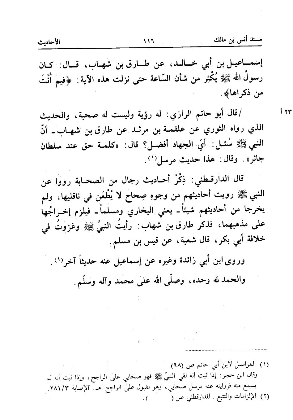 إِسْمَاعِيلَ بْنِ أَبِي خَالِدٍ عَنْ طَارِقِ بْنِ شِهَابٍ قَالَ كَانَ رَسُولُ اللَّهِ صَلَّى اللَّهُ عَلَيْهِ وَسَلَّمَ يُكْثِرُ مِنْ ذِكْرِ شَأْنِ السَّاعَةِ حَتَّى نَزَلَتْ هَذِهِ الآيَةُ {فِيمَ أَنْتَ مِنْ ذكرَاهَا} قَالَ أَبُو حَاتِمٍ الرَّازِيُّ لَهُ رُؤْيَةٌ وَلَيْسَتْ لَهُ صُحْبَةٌ وَالْحَدِيثُ الَّذِي رَوَاهُ الثَّوْرِيُّ عَنْ عَلْقَمَةَ بْنِ مَرْثَدٍ عَنْ طَارِقِ بْنِ شِهَابٍ أَنَّ النَّبِيَّ صَلَّى اللَّهُ عَلَيْهِ وَسَلَّمَ سُئِلَ أَيُّ الْجِهَادِ أَفْضَلُ قَالَ (كَلِمَةُ حَقٍّ عِنْدَ سُلْطَانٍ جَائِرٍ) وَقَالَ هَذَا حَدِيثٌ مُرْسَلٌ قَالَ الدَّارَقُطْنِيُّ ذَكَرَ أَحَادِيثَ رِجَالٍ مِنَ الصَّحَابَةِ رَوَوْا عَنِ النَّبِيِّ صَلَّى اللَّهُ عَلَيْهِ وَسَلَّمَ رُوِيَتْ أَحَادِيثُهُمْ مِنْ وُجُوهٍ صِحَاحٍ لَا يُطْعَنُ فِي نَاقِلِيهَا وَلَمْ يُخَرِّجَا مِنْ أَحَادِيثِهِمْ شَيْئًا يَعْنِي الْبُخَارِيَّ وَمُسْلِمًا فَيَلْزَمُ إِخْرَاجُهَا عَلَى مَذْهَبِهِمَا فَذَكَرَ طَارِقُ بْنُ شِهَابٍ رَأَيْتُ النَّبِيَّ صَلَّى اللَّهُ عَلَيْهِ وَسَلَّمَ وَغَزَوْتُ فِي خِلافَةِ أَبِي بَكْرٍ قَالَ شُعْبَةُ عَنْ قَيْسِ بْنِ مُسْلِمٍ وَرَوَى بن أَبِي زَائِدَةَ وَغَيْرُهُ عَنْ إِسْمَاعِيلَ عَنْهُ حَدِيثٌ آخَرُ وَالْحَمْدُ للَّهِ وَحْدَهُ وَصَلَّى اللَّهُ عَلَى مُحَمَّدٍ وَآلِهِ وَسَلِّمْ