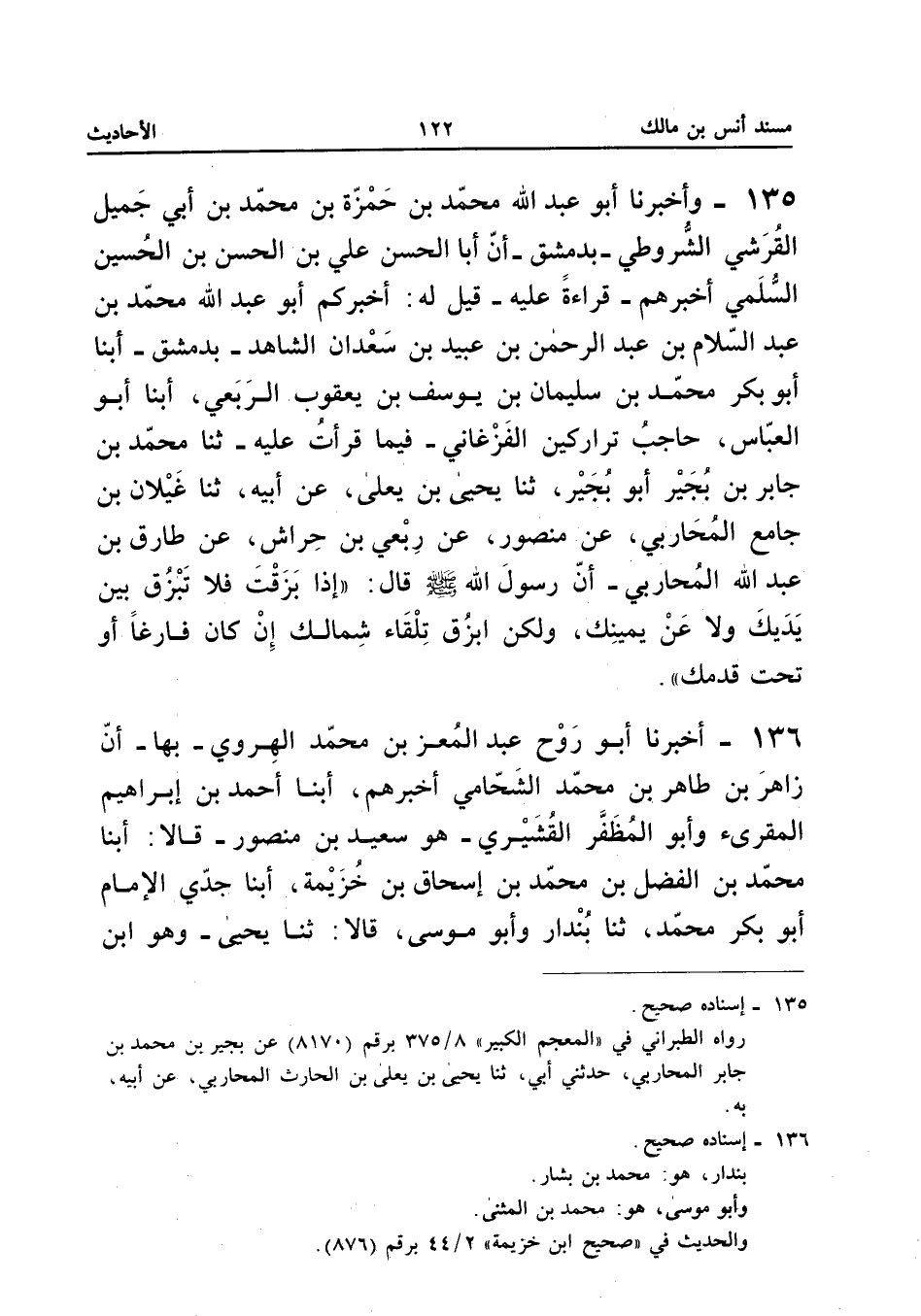 135 - وَأخْبرنَا أَبُو عبد الله مُحَمَّدُ بْنُ حَمْزَةَ بْنِ مُحَمَّدِ بْنِ أَبِي جَمِيلٍ الْقُرَشِيُّ الشُّرُوطِيُّ بِدِمَشْقَ أَنَّ أَبَا الْحَسَنِ عَلِيَّ بْنَ الْحَسَنِ بْنِ الْحُسَيْنِ السُّلَمِيَّ أَخْبَرَهُمْ قِرَاءَة عَلَيْهِ قيل لَهُ أخْبركُم أَبُو عبد الله مُحَمَّد بن عبد السَّلَام بن عبد الرَّحْمَن بْنِ عُبَيْدِ بْنِ سَعْدَانَ الشَّاهِدُ بِدِمَشْقَ أبنا أَبُو بَكْرٍ مُحَمَّدُ بْنُ سُلَيْمَانَ بْنِ يُوسُفَ بْنِ يَعْقُوبَ الرَّبَعِيُّ أبنا أَبُو الْعَبَّاسِ حَاجِبُ تراركين الفزغاني فِيمَا قَرَأْتُ عَلَيْهِ ثَنَا مُحَمَّدُ بْنُ جَابِرِ بْنِ بُجَيْرٍ أَبُو بُجَيْرٍ ثَنَا يَحْيَى بْنُ يَعْلَى عَنْ أَبِيهِ ثَنَا غَيْلانُ بْنُ جَامِعٍ الْمحَاربي عَن مَنْصُور عَن ربعي بن جراش عَن طَارق بن عبد الله الْمُحَارِبِيِّ أَنَّ رَسُولَ اللَّهِ صَلَّى اللَّهُ عَلَيْهِ وَسَلَّمَ قَالَ (إِذَا بَزَقْتَ فَلا تَبْزُقْ بَيْنَ يَدَيْكَ وَلا عَنْ يَمِينِكَ وَلَكِنِ ابْزُقْ تِلْقَاءَ شِمَالِكَ إِنْ كَانَ فَارِغًا أَوْ تَحْتَ قَدَمِكَ) إِسْنَاده صَحِيح