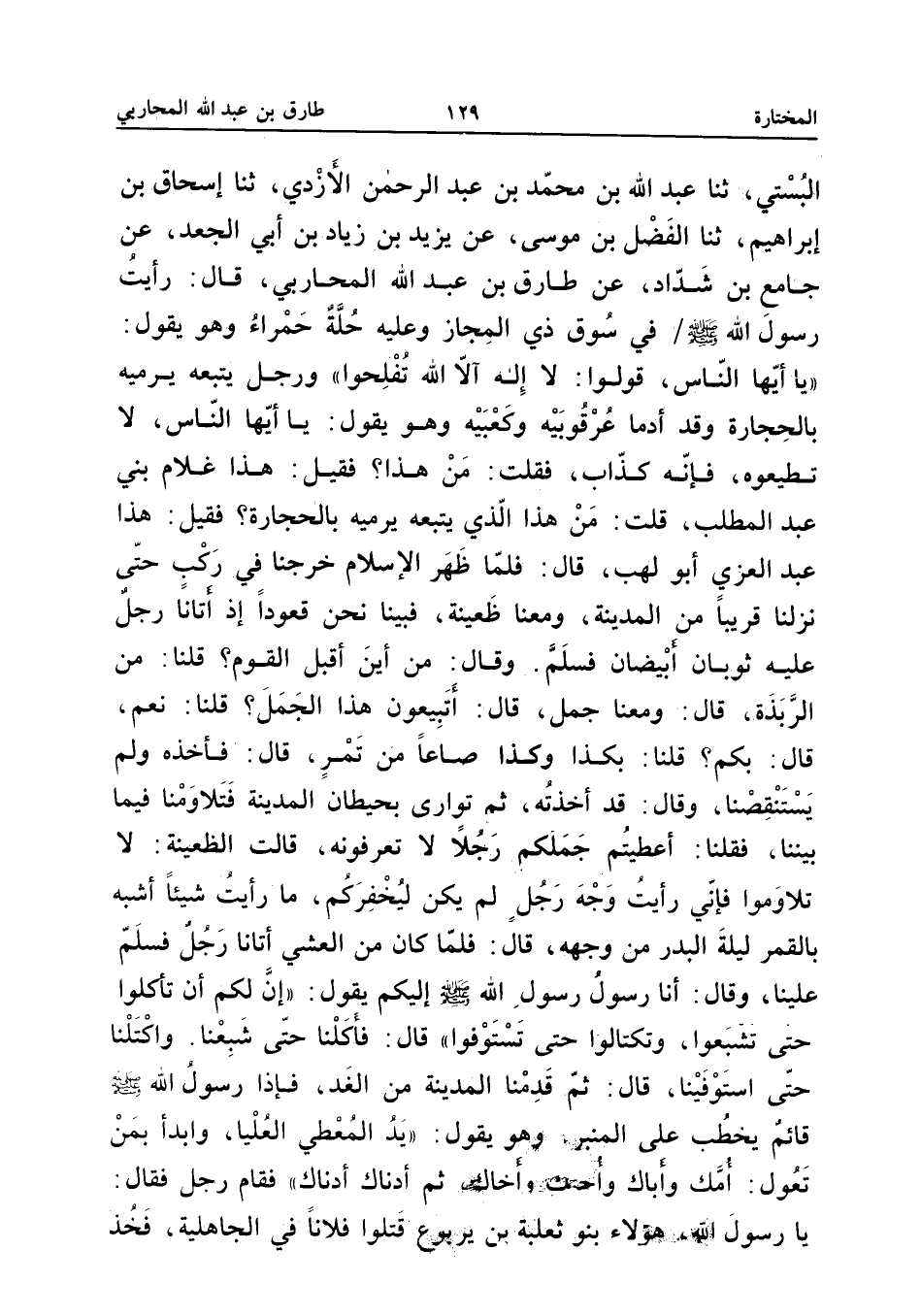 البستي ثَنَا عبد الله بن مُحَمَّد بن عبد الرَّحْمَن الأَزْدِيُّ ثَنَا إِسْحَاقُ بْنُ إِبْرَاهِيمَ ثَنَا الْفَضْلُ بْنُ مُوسَى عَنْ يَزِيدَ بْنِ زِيَادِ بْنِ أَبِي الْجَعْدِ عَنْ جَامِعِ بْنِ شَدَّادٍ عَنْ طَارق بن عبد الله الْمُحَارِبِيِّ قَالَ رَأَيْتُ رَسُولَ اللَّهِ صَلَّى اللَّهُ عَلَيْهِ وَسَلَّمَ فِي سُوقِ الْمَجَازِ وَعَلَيْهِ حُلَّةٌ حَمْرَاء وَهُوَ يَقُول (يَا أَيُّهَا النَّاسُ قُولُوا لَا إِلَهَ إِلا اللَّهُ تُفْلِحُوا) وَرجل يتبعهُ يرميه بِالْحِجَارَةِ وَقد أدما عرقوبيه وكعبيه وَهُوَ يَقُول يَا أَيهَا النَّاسُ لَا تُطِيعُوهُ فَإِنَّهُ كَذَّابٌ فَقُلْتُ مَنْ هَذَا فَقيل هَذَا غُلَام بني عبد الْمطلب قُلْتُ مَنْ هَذَا الَّذِي يَتْبَعُهُ يَرْمِيهِ بِالْحِجَارَةِ هَذَا عبد الْعزي أَبُو لَهَبٍ قَالَ فَلَمَّا ظَهَرَ الإِسْلامُ خَرَجْنَا فِي رَكْبٍ حَتَّى نَزَلْنَا قَرِيبًا مِنَ الْمَدِينَةِ وَمَعَنَا ظَعِينَةٌ فَبَيْنَا نَحْنُ قُعُودٌ إِذْ أَتَانَا رَجُلٌ عَلَيْهِ ثَوْبَانٍ أَبْيَضَانِ فَسَلَّمَ وَقَالَ مِنْ أَيْنَ أَقْبَلَ الْقَوْمُ قُلْنَا مِنَ الرَّبَذَةِ قَالَ وَمَعَنَا جَمَلٌ قَالَ أَتَبِيعُونَ هَذَا الْجَمَلَ قُلْنَا نَعَمْ قَالَ بِكَمْ قُلْنَا بِكَذَا وَكَذَا صَاعًا مِنْ تَمْرٍ قَالَ فَأَخَذَهُ وَلَمْ يَسْتَنْقِصْنَا وَقَالَ قَدْ أَخَذْتُهُ ثُمَّ تَوَارَى بِحِيطَانِ الْمَدِينَةِ فَتَلاوَمْنَا فِيمَا بَيْنَنَا فَقُلْنَا أَعْطَيْتُمْ جَمَلَكُمْ رَجُلا لَا تَعْرِفُونَهُ قَالَتِ الظَّعِينَةُ لَا تَلاوَمُوا فَإِنِّي رَأَيْتُ وَجْهَ رَجُلٍ لَمْ يَكُنْ لِيُخْفِرَكُمْ مَا رَأَيْتُ شَيْئًا أَشْبَهَ بِالْقَمَرِ لَيْلَةَ الْبَدْرِ مِنْ وَجْهِهِ قَالَ فَلَمَّا كَانَ مِنَ الْعَشِيِّ أَتَانَا رَجُلٌ فَسَلَّمَ عَلَيْنَا وَقَالَ أَنَا رَسُولُ رَسُولِ اللَّهِ صَلَّى اللَّهُ عَلَيْهِ وَسَلَّمَ إِلَيْكُمْ يَقُولُ (إِنَّ لَكُمْ أَنْ تَأْكُلُوا حَتَّى تَشْبَعُوا وَتَكْتَالُوا حَتَّى تَسْتَوْفُوا) قَالَ فَأَكَلْنَا حَتَّى شَبِعْنَا وَاكْتَلْنَا حَتَّى اسْتَوْفَيْنَا قَالَ ثُمَّ قَدِمْنَا الْمَدِينَةَ مِنَ الْغَدِ فَإِذَا رَسُولُ اللَّهِ صَلَّى اللَّه عَلَيْهِ وَسَلَّمَ قَائِمٌ يَخْطُبُ عَلَى الْمِنْبَرِ وَهُوَ يَقُولُ (يَدُ الْمُعْطِي الْعُلْيَا وَابْدَأْ بِمَنْ تَعُولُ أُمَّكَ وَأَبَاكَ أُخْتَكَ وَأَخَاكَ ثُمَّ أَدْنَاكَ أَدْنَاكَ) فَقَامَ رَجُلٌ فَقَالَ يَا رَسُولَ اللَّهِ هَؤُلاءِ بَنُو ثَعْلَبَة بْنُ يَرْبُوعٍ قَتَلُوا فُلانًا فِي الْجَاهِلِيَّةِ فَخُذْ
