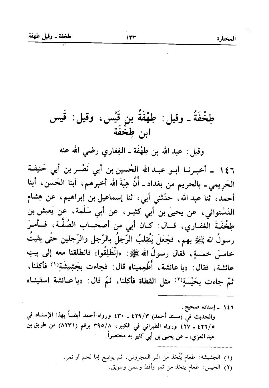 146 - أخبرنَا أَبُو عبد الله الْحُسَيْنُ بْنُ أَبِي نَصْرِ بْنِ أَبِي حَنِيفَةَ الْحَرِيمِيُّ بِالْحَرِيمِ مِنْ بَغْدَادَ أَنَّ هِبَةَ اللَّهِ أخْبرهُم أبنا الْحسن أبنا أَحْمد ثَنَا عبد الله حَدَّثَنِي أَبِي ثَنَا إِسْمَاعِيلُ بْنُ إِبْرَاهِيمَ عَنْ هِشَامٌ الدَّسْتُوَائِيُّ عَنْ يَحْيَى بْنِ أَبِي كَثِيرٍ عَنْ أَبِي سَلَمَةَ عَنْ يَعِيشَ بْنِ طِخْفَةَ الْغِفَارِيِّ قَالَ كَانَ أَبِي مِنْ أَصْحَابِ الصُّفَّةِ فَأَمَرَ رَسُولُ اللَّهِ صَلَّى اللَّهُ عَلَيْهِ وَسَلَّمَ بِهِمْ فَجَعَلَ يَنْقَلِبُ الرَّجُلُ بِالرَّجُلِ وَالرَّجُلَيْنِ حَتَّى بَقِيتُ خَامِسَ خَمْسَةٍ فَقَالَ رَسُولُ اللَّهِ صَلَّى اللَّهُ عَلَيْهِ وَسَلَّم (انْطَلِقُوا) فَانْطَلَقْنَا مَعَهُ إِلَى بَيْتِ عَائِشَةَ فَقَالَ (يَا عَائِشَةُ أَطْعِمِينَا) قَالَ فَجَاءَتْ بِجَشِيشَةٍ فَأَكَلْنَا ثُمَّ جَاءَتْ بِحَيْسَةٍ مِثْلَ الْقَطَاةِ فَأَكَلْنَا ثُمَّ قَالَ (يَا عَائِشَةُ اسْقِينَا)