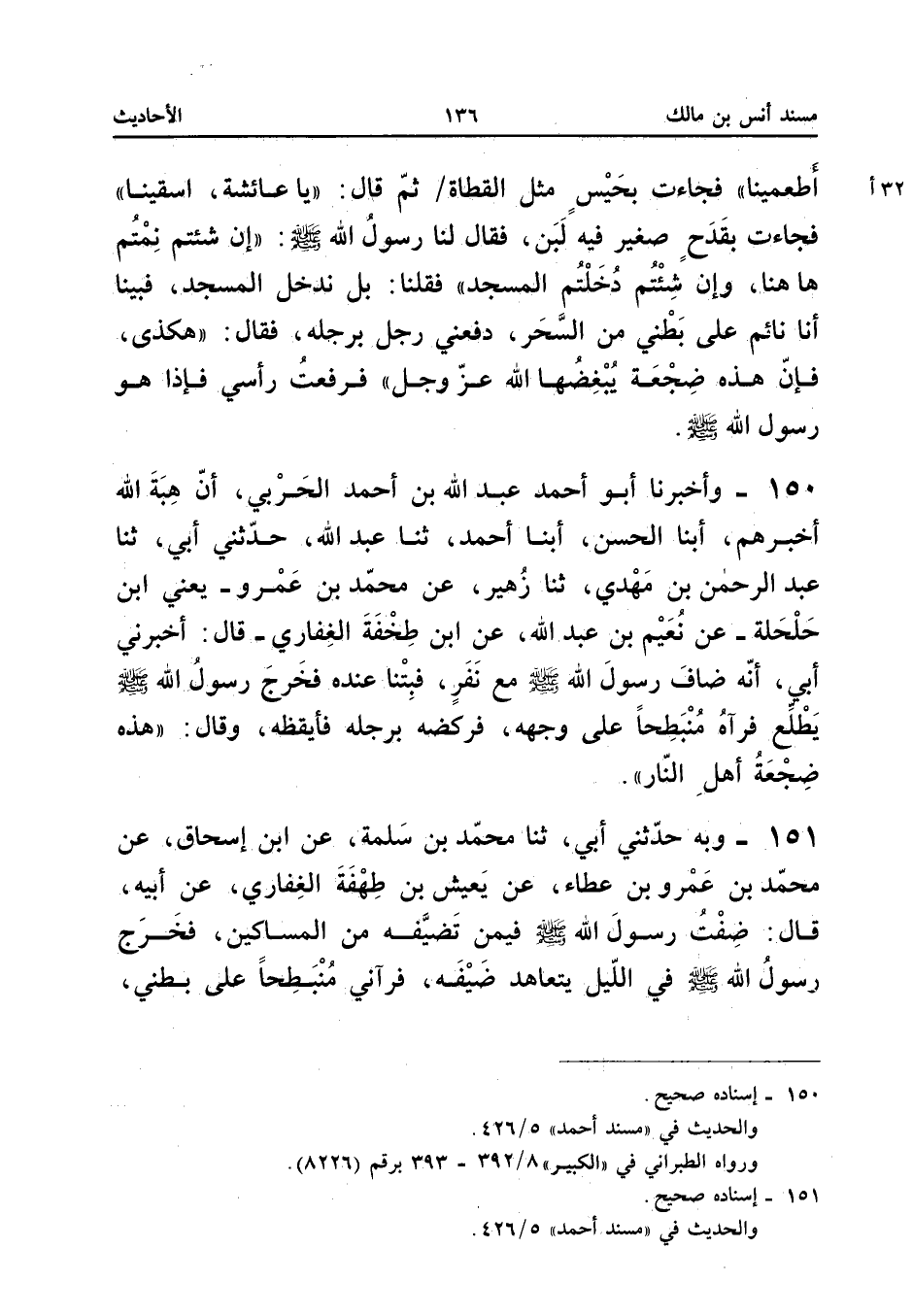 150 - وَأخْبرنَا أَبُو أَحْمد عبد الله بْنُ أَحْمَدَ الْحَرْبِيُّ أَنَّ هِبَةَ اللَّهِ أَخْبَرَهُمْ أبنا الْحسن أبنا أَحْمد ثَنَا عبد الله حَدثنِي أبي ثَنَا عبد الرَّحْمَن بْنُ مَهْدِيٍّ ثَنَا زُهَيْرٌ عَنْ مُحَمَّدِ بْنِ عَمْرٍو يَعْنِي ابْنَ حَلْحَلَةَ عَنْ نُعَيْمِ بْنِ عبد الله عَنِ ابْنِ طِخْفَةَ الْغِفَارِيِّ قَالَ أَخْبَرَنِي أَبِي أَنَّهُ ضَافَ رَسُولَ اللَّهِ صَلَّى اللَّهُ عَلَيْهِ وَسَلَّمَ مَعَ نَفَرٍ فَبِتْنَا عِنْدَهُ فَخَرَجَ رَسُولُ اللَّهِ صَلَّى اللَّهُ عَلَيْهِ وَسَلَّمَ يَطَّلِعُ فَرَآهُ مُنْبَطِحًا عَلَى وَجْهِهِ فَرَكَضَهُ بِرِجْلِهِ فَأَيْقَظَهُ وَقَالَ (هَذِه ضجعة أهل النَّار) إِسْنَاده صَحِيح