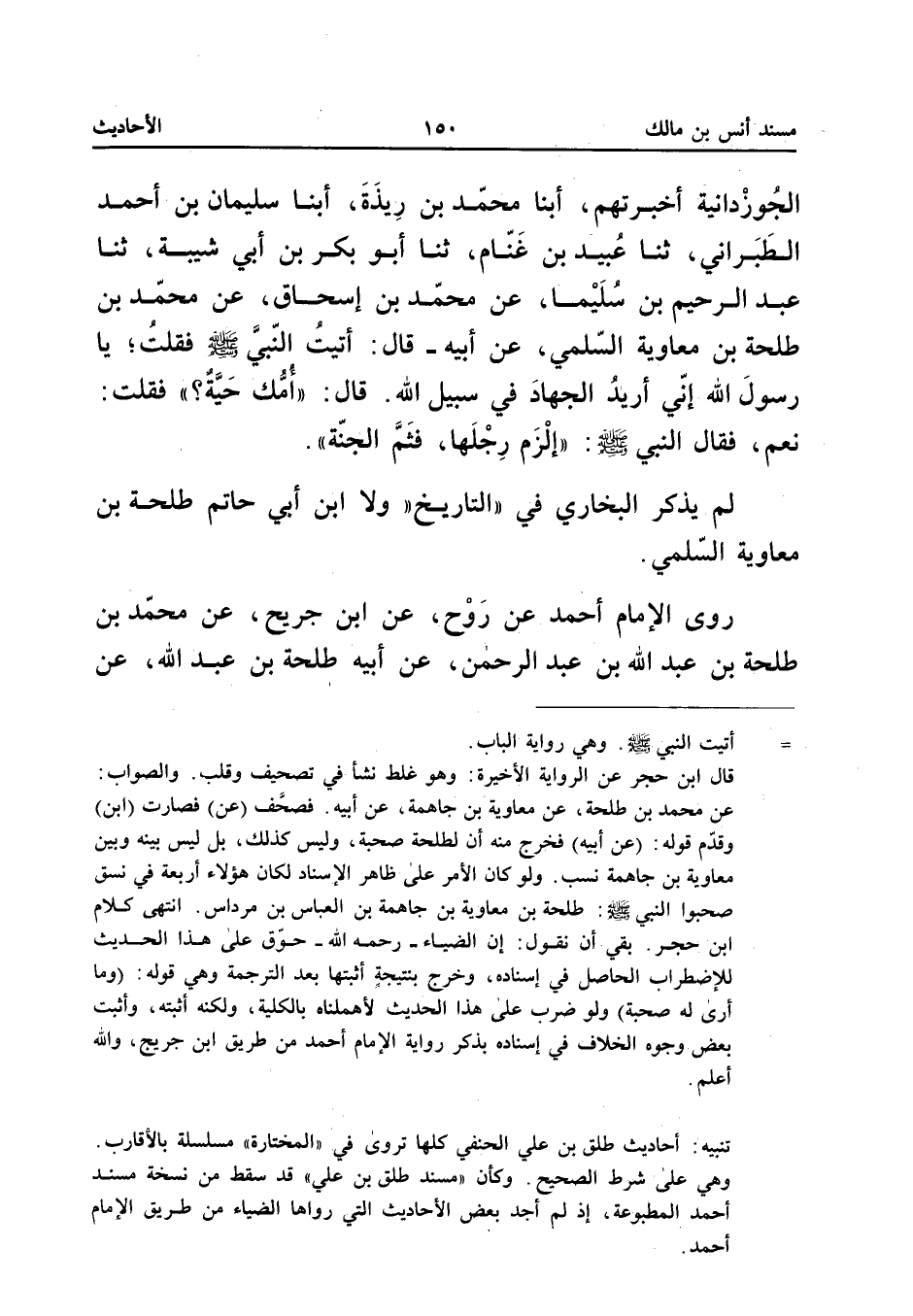 الْجَوْزَدَانِيَّةَ أَخْبَرَتْهُمْ أبنا مُحَمَّدُ بْنُ رِيذَةَ أبنا سُلَيْمَان بن أَحْمد الطَّبَرَانِيّ ثَنَا عبيد غَنَّامٍ ثَنَا أَبُو بَكْرِ بْنُ أَبِي شَيْبَةَ ثَنَا عبد الرَّحِيم بْنُ سُلَيْمَانَ عَنْ مُحَمَّدِ بْنِ إِسْحَاقَ عَنْ مُحَمَّدِ بْنِ طَلْحَةَ بْنِ مُعَاوِيَةَ السُّلَمِيِّ عَنْ أَبِيهِ قَالَ أَتَيْتُ النَّبِيَّ صَلَّى اللَّهُ عَلَيْهِ وَسَلَّمَ فَقُلْتُ يَا رَسُولَ اللَّهِ إِنِّي أُرِيدُ الْجِهَادَ فِي سَبِيلِ اللَّهِ قَالَ (أُمُّكَ حَيَّةٌ) فَقُلْتُ نَعَمْ فَقَالَ النَّبِيُّ صَلَّى اللَّهُ عَلَيْهِ وَسَلَّمَ (الْزَمْ رِجْلَهَا فَثَمَّ الْجَنَّةُ) لَمْ يَذْكُرِ الْبُخَارِيُّ فِي (التَّارِيخِ) وَلا ابْنُ أَبِي حَاتِمٍ طَلْحَةَ بْنَ مُعَاوِيَةَ السُّلَمِيَّ رَوَى الإِمَامُ أَحْمَدُ عَنْ رَوْحٍ عَنِ ابْنِ جُرَيْحٍ عَنْ مُحَمَّدِ بن طَلْحَة بن عبد الله بن عبد الرَّحْمَن عَن أَبِيه طَلْحَة بن عبد الله عَن