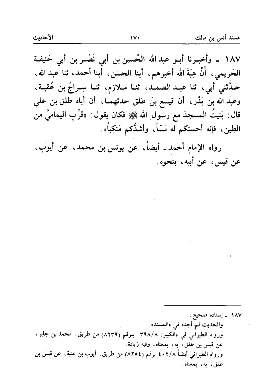 187 - وَأخْبرنَا أَبُو عبد الله الْحُسَيْنُ بْنُ أَبِي نَصْرِ بْنِ أَبِي حَنِيفَةَ الْحَرِيمِيُّ أَنَّ هِبَةَ اللَّهِ أَخْبَرَهُمْ أبنا الْحَسَنُ أبنا أَحْمد ثَنَا عبد الله حَدثنِي أبي ثَنَا عبد الصَّمد ثَنَا ملازم ثَنَا سراج بن عقبَة وَعبد الله بْنُ بَدْرٍ أَنَّ قَيْسَ بْنَ طَلْقٍ حَدَّثَهُمَا أَنَّ أَبَاهُ طَلْقَ بْنَ عَلِيٍّ قَالَ بَنَيْتُ الْمَسْجِدَ مَعَ رَسُولِ اللَّهِ صَلَّى اللَّهُ عَلَيْهِ وَسَلَّمَ فَكَانَ يَقُولُ (قَرِّبِ الْيَمَامِيَّ مِنَ الطِّينِ فَإِنَّهُ أَحْسَنُكُمْ لَهُ مَسًّا وَأَشَدُّكُمْ مَنْكِبًا) رَوَاهُ الإِمَامُ أَحْمَدُ أَيْضًا عَنْ يُونُسَ بْنِ مُحَمَّدٍ عَنْ أَيُّوبَ عَنْ قَيْسٍ عَنْ أَبِيهِ بِنَحْوِهِ