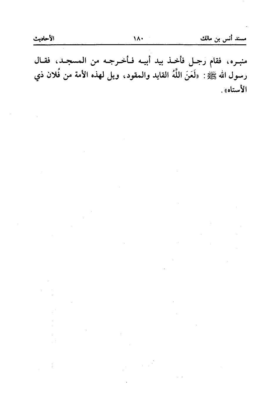مِنْبَرِهِ فَقَامَ رَجُلٌ فَأَخَذَ بِيَدِ أَبِيهِ فَأَخْرَجَهُ مِنَ الْمَسْجِدِ فَقَالَ رَسُولُ اللَّهِ صَلَّى اللَّهُ عَلَيْهِ وَسَلَّمَ (لَعَنَ اللَّهُ الْقَايِدَ وَالْمَقُودَ وَيْلٌ لِهَذِهِ الأُمَّةُ مِنْ فُلانٍ ذِي الأَسْتَاهِ)