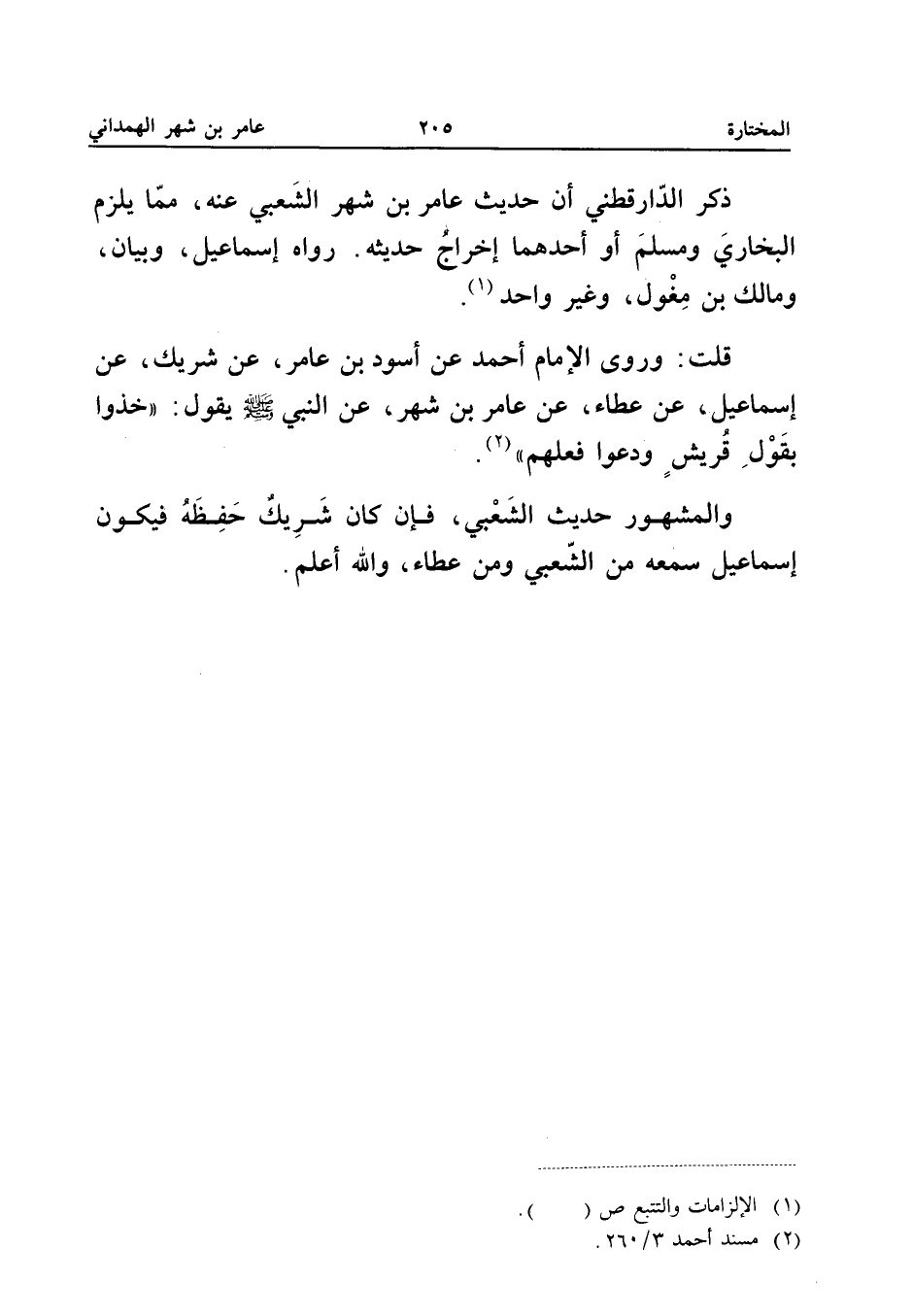 ذَكَرَ الدَّارَقُطْنِيُّ أَنَّ حَدِيثَ عَامِرِ بْنِ شَهْرٍ الشّعبِيّ عَنهُ مِمَّا يَلْزَمُ الْبُخَارِيُّ وَمُسْلِمٌ أَوْ أَحَدُهُمَا إِخْرَاجَ حَدِيثِهِ رَوَاهُ إِسْمَاعِيلُ وَبَيَانٌ وَمَالِكُ بْنُ مِغْوَلٍ غير وَاحِدٍ قُلْتُ وَرَوَى الإِمَامُ أَحْمَدُ عَنْ أَسْوَدَ بْنِ عَامِرٍ عَنْ شَرِيكٍ عَنْ إِسْمَاعِيلَ عَنْ عَطَاءٍ عَنْ عَامِرِ بْنِ شَهْرٍ عَنِ النَّبِيِّ صَلَّى اللَّهُ عَلَيْهِ وَسَلَّمَ يَقُولُ (خُذُوا بِقَوْلِ قُرَيْشٍ وَدَعُوا فِعْلَهُمْ) وَالْمَشْهُورُ حَدِيثُ الشَّعْبِيِّ فَإِنْ كَانَ شَرِيكٌ حَفِظَهُ فَيَكُونُ إِسْمَاعِيلُ سَمِعَهُ مِنَ الشَّعْبِيِّ وَمِنْ عَطَاءٍ وَاللَّهُ أَعْلَمُ