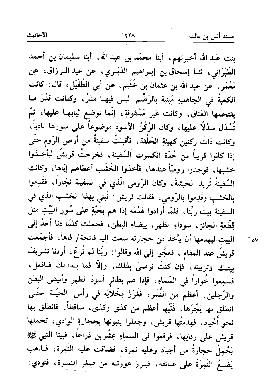 بنت عبد الله أَخْبَرتهم أبنا مُحَمَّد بن عبد الله أبنا سُلَيْمَانُ بْنُ أَحْمَدَ الطَّبَرَانِيُّ ثَنَا إِسْحَاقُ بن إِبْرَاهِيم الدبرِي عَن عبد الرَّزَّاق عَن معمر عَن عبد الله بْنِ عُثْمَانَ بْنِ خَثْيَمٍ عَنْ أَبِي الطُّفَيْلِ قَالَ كَانَتِ الْكَعْبَةُ فِي الْجَاهِلِيَّةِ مَبْنِيَّةٌ بِالرَّضْمِ لَيْسَ فِيهَا مَدَرٌ وَكَانَتْ قَدْرَ مَا يَقْتَحِمُهَا العناق وَكَانَت غير مسقوفة إِنَّمَا تُوضَع عَلَيْهَا ثِيَابَهَا عَلَيْهَا ثُمَّ تُسْدَلُ سَدْلا عَلَيْهَا وَكَانَ الرُّكْنُ الأَسْوَدُ مَوْضُوعًا عَلَى سُورِهَا بَادِيًا وَكَانَتْ ذَاتَ رُكْنَيْنِ كَهَيْئَةِ الْحَلَقَةِ فَأَقْبَلَتْ سَفِينَةٌ مِنْ أَرْضِ الرُّومِ حَتَّى إِذَا كَانُوا قَرِيبًا مِنْ جُدَّةَ انْكَسَرَتِ السَّفِينَةُ فَخَرَجَتْ قُرَيْشٌ لِيَأْخُذُوا خَشَبَهَا فوجودا رُومِيًّا عِنْدَهَا فَأَخَذُوا الْخَشَبَ أَعْطَاهُمْ إِيَّاهَا وَكَانَتِ السَّفِينَةُ تُرِيدُ الْحَبَشَةَ وَكَانَ الرُّومِيُّ الَّذِي فِي السَّفِينَة نجارا فقدموا بالخشب والرومي فَقَالَت قُرَيْش نَبْنِي بِهَذَا الْخشب الَّذِي السَّفِينَةِ بَيْتَ رَبِّنَا فَلَمَّا أَرَادُوا هَدْمَهُ إِذَا هُمْ بِحَيَّةٍ عَلَى سُورِ الْبَيْتِ مِثْلِ قِطْعَةِ الْجَائِزِ سَوْدَاءِ الظَّهْرِ بَيْضَاءِ الْبَطْنِ فَجَعَلَتْ كُلَّمَا دنا أحد إِلَى لِيَهْدِمَهَا أَنْ يَأْخُذَ مِنْ حِجَارَتِهِ سَعَتْ إِلَيْهِ فَاتِحَةً فَاهَا فَأَجْمَعَتْ قُرَيْشٌ عِنْدَ الْمَقَامِ فَعَجُّوا إِلَى اللَّهِ وَقَالُوا رَبَّنَا لَمْ تُرعْ أَرَدْنَا تَشْرِيفَ بَيْتِكَ وَتَزْيِينِهِ فَإِنْ كُنْتَ تَرْضَى بِذَلِكَ وَإِلا فَمَا بَدَا لَكَ فَافْعَلْ فَسَمِعُوا خُوَارًا فِي السَّمَاءِ فَإِذَا هُمْ بِطَائِرٍ أَسْوَدِ الظَّهْرِ أَبْيَضِ الْبَطْنِ وَالرِّجْلَيْنِ أَعْظَمَ مِنَ النَّسْرِ فَغَرَزَ مِخْلابَهُ فِي رَأْسِ الْحَيَّةِ حَتَّى انْطَلَقَ بِهَا يجرها ذنبها أعظم من كذى وكذى سَاقِطًا فَانْطَلَقَ بِهَا نَحْوَ أَجْيَادَ فَهَدَمَتْهَا قُرَيْشٌ وَجَعَلُوا يَبْنُونَهَا بِحِجَارَةِ الْوَادِي تَحْمِلُهَا قُرَيْشٌ عَلَى رِقَابِهَا فَرَفَعُوا فِي السَّمَاءِ عِشْرِينَ ذِرَاعًا فَبَيْنَا النَّبِيُّ صَلَّى اللَّهُ عَلَيْهِ وَسَلَّمَ يَحْمِلُ حِجَارَةً مِنْ أَجْيَادَ وَعَلَيْهِ نَمِرَةٌ فَضَاقَتْ عَلَيْهِ النَّمِرَةُ فَذهب يضع النمر عَلَى عَاتِقِهِ فَبَرَزَ عَوْرَتُهُ مِنْ صِغَرِ النَّمِرَةِ فَنُوديَ