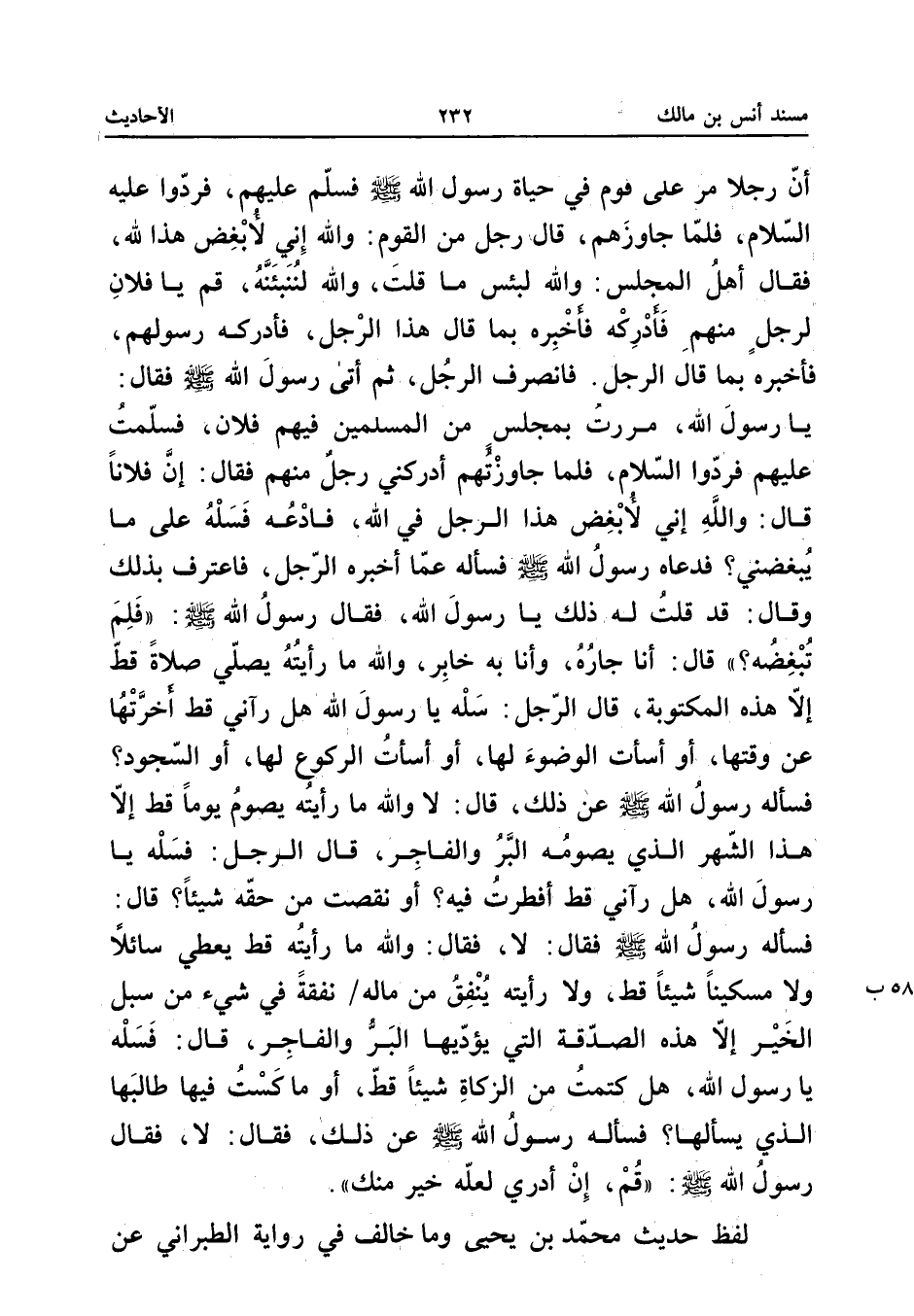 أَنَّ رَجُلا مَرَّ عَلَى قَوْمٍ فِي حَيَاةِ رَسُولِ اللَّهِ صَلَّى اللَّهُ عَلَيْهِ وَسَلَّمَ فَسَلَّمَ عَلَيْهِمْ فَرَدُّوا عَلَيْهِ السَّلامُ فَلَمَّا جَاوَزَهُمْ قَالَ رَجُلٌ مِنَ الْقَوْمِ وَاللَّهِ إِنِّي لأُبْغِضُ هَذَا للَّهِ فَقَالَ أَهْلُ الْمَجْلِسِ وَاللَّهِ لَبِئْسَ مَا قُلْتَ وَاللَّهِ لَنُنَبِّئَنَّهُ قُمْ يَا فُلانُ لِرَجُلٍ مِنْهُمْ فَأَدْرِكْهُ فَأَخْبِرْهُ بِمَا قَالَ هَذَا الرَّجُلُ فَأَدْرَكَهُ رَسُولُهُمْ فَأَخْبَرَهُ بِمَا قَالَ الرَّجُلُ فَانْصَرَفَ الرَّجُلُ ثُمَّ أَتَى رَسُولَ اللَّهِ صَلَّى اللَّهُ عَلَيْهِ وَسَلَّمَ فَقَالَ يَا رَسُولَ اللَّهِ مَرَرْتُ بِمَجْلِسٍ مِنَ الْمُسْلِمِينَ فِيهِمْ فُلانٌ فَسَلَّمْتُ عَلَيْهِمْ فَرَدُّوا السَّلامَ فَلَمَّا جَاوَزْتُهُمْ أَدْرَكَنِي رَجُلٌ مِنْهُمْ فَقَالَ إِنَّ فُلانًا قَالَ وَاللَّهِ إِنِّي لأُبْغِضُ هَذَا الرَّجُلَ فِي اللَّهِ فَادْعُهُ فَسَلْهُ عَلَى مَا يُبْغِضُنِي فَدَعَاهُ رَسُولُ اللَّهِ صَلَّى اللَّهُ عَلَيْهِ وَسَلَّمَ فَسَأَلَهُ عَمَّا أَخْبَرَهُ الرَّجُلُ فَاعْتَرَفَ بِذَلِكَ وَقَالَ قَدْ قُلْتُ لَهُ ذَلِكَ يَا رَسُولَ اللَّهِ فَقَالَ رَسُولُ اللَّهِ صَلَّى اللَّهُ عَلَيْهِ وَسَلَّمَ (فَلِمَ تُبْغِضُهُ) قَالَ أَنَا جَارُهُ وَأَنَا بِهِ خَابِرٌ وَاللَّهِ مَا رَأَيْتُهُ يُصَلِّي صَلاةً قَطُّ إِلا هَذِهِ الْمَكْتُوبَةَ قَالَ الرَّجُلُ سَلْهُ يَا رَسُولَ اللَّهِ هَلْ رَآنِي قَطُّ أَخَّرْتُهَا عَنْ وَقْتِهَا أَوْ أَسَأْتُ الْوُضُوءَ لَهَا أَوْ أَسَأْتُ الرُّكُوعَ لَهَا أَوِ السُّجُودَ فَسَأَلَهُ رَسُولِ اللَّهِ صَلَّى اللَّهُ عَلَيْهِ وَسَلَّمَ عَنْ ذَلِكَ قَالَ لَا وَاللَّهِ مَا رَأَيْتُهُ يَصُومُ يَوْمًا قَطُّ إِلا هَذَا الشَّهْرَ الَّذِي يَصُومُهُ الْبَرُّ وَالْفَاجِرُ قَالَ الرَّجُلُ فَسَلْهُ يَا رَسُولَ اللَّهِ هَلْ رَآنِي قَدْ أَفْطَرْتُ فِيهِ أَوْ أَنْقَصْتُ مِنْ حَقِّهِ شَيْئًا قَالَ فَسَأَلَهُ رَسُولُ اللَّهِ صَلَّى اللَّهُ عَلَيْهِ وَسَلَّمَ فَقَالَ لَا فَقَالَ وَاللَّهِ مَا رَأَيْتُهُ قَطُّ يُعْطِي سَائِلا وَلا مِسْكِينًا شَيْئًا قَطُّ وَلا رَأَيْتُهُ يُنْفِقُ مِنْ مَالِهِ نَفَقَةً فِي شَيْءٍ مِنْ سُبُلِ الْخَيْرِ إِلا هَذِهِ الصَّدَقَةَ الَّتِي يُؤَدِّيهَا الْبَرُّ وَالْفَاجِرُ قَالَ فَسَلْهُ يَا رَسُولَ اللَّهِ هَلْ كَتَمْتُ مِنَ الزَّكَاةِ شَيْئًا قَطُّ أَوْ مَاكَسْتُ فِيهَا طَالِبَهَا الَّذِي يَسْأَلُهَا فَسَأَلَهُ رَسُولُ اللَّهِ صَلَّى اللَّهُ عَلَيْهِ وَسَلَّمَ عَنْ ذَلِكَ فَقَالَ لَا فَقَالَ رَسُولُ اللَّهِ صَلَّى اللَّهُ عَلَيْهِ وَسَلَّمَ (قُمْ إِنْ أَدْرِي لَعَلَّهُ خَيْرٌ مِنْكَ) لَفْظُ حَدِيثِ مُحَمَّدِ بْنِ يَحْيَى وَمَا خَالَفَ فِي رِوَايَة الطَّبَرَانِيّ عَن