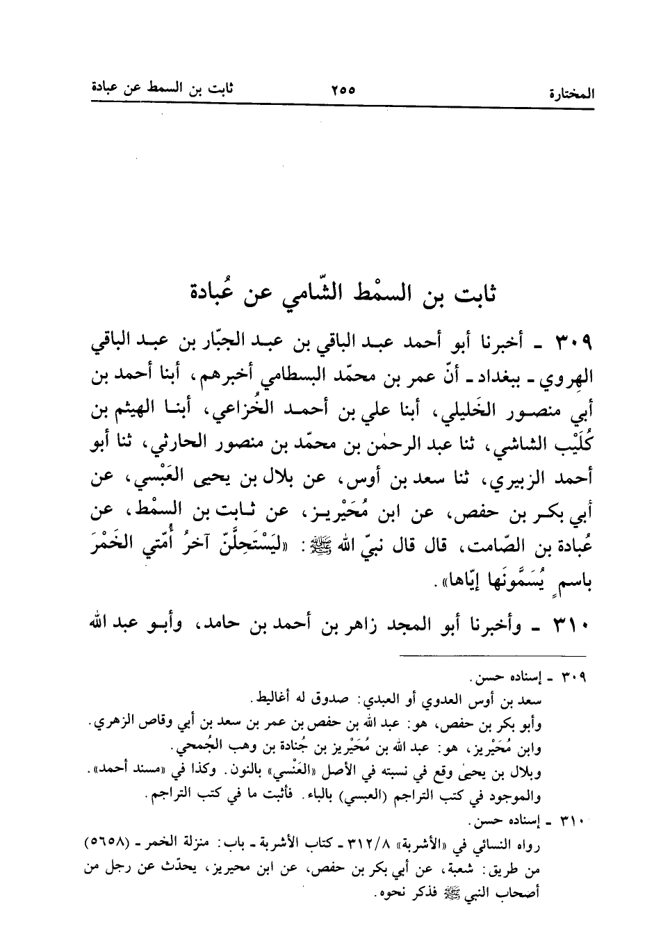 309 - أخبرنَا أَبُو أَحْمد عبد الْبَاقِي بن عبد الْجَبَّار بن عبد الْبَاقِي الْهَرَوِيُّ بِبَغْدَادَ أَنَّ عُمَرَ بْنَ مُحَمَّدٍ الْبَسْطَامِيَّ أَخْبَرَهُمْ أبنا أَحْمَدُ بْنُ أَبِي مَنْصُورٍ الْخَلِيلِيُّ أبنا عَلِيُّ بْنُ أَحْمَدَ الْخُزَاعِيُّ أبنا الْهَيْثَمُ بن كُلَيْب الشَّاشِي ثَنَا عبد الرَّحْمَن بْنُ مُحَمَّدِ بْنِ مَنْصُورٍ الْحَارِثِيُّ ثَنَا أَحْمَدُ الزُّبَيْرِيُّ ثَنَا سَعْدُ بْنُ أَوْسٍ عَنْ بِلالِ بْنِ يَحْيَى الْعَبْسِيِّ عَنْ أَبِي بَكْرِ بْنِ حَفْصٍ عَنِ ابْنِ مُحَيْرِيزٍ عَنْ ثَابِتِ بْنِ السِّمْطِ عَنْ عُبَادَةَ بْنِ الصَّامِتِ قَالَ قَالَ نَبِيُّ اللَّهِ صَلَّى اللَّهُ عَلَيْهِ وَسَلَّمَ (لَيَسْتَحِلَّنَّ آخر أمتِي الْخمر باسم يسمونها إِيَّاهَا) إِسْنَاده حسن
