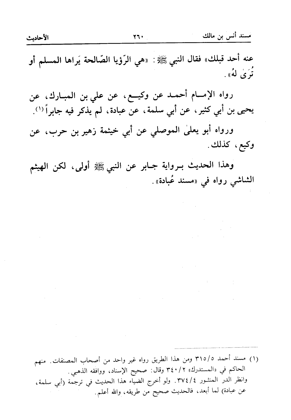 عَنْهُ أَحَدٌ قَبْلَكَ) فَقَالَ النَّبِيُّ صَلَّى اللَّهُ عَلَيْهِ وَسَلَّمَ (هِيَ الرُّؤْيَا الصَّالِحَةُ يَرَاهَا الْمُسْلِمُ أَوْ تُرَى لَهُ) رَوَاهُ الإِمَامُ أَحْمَدُ عَنْ وَكِيعٍ عَنْ عَلِيِّ بْنِ الْمُبَارَكِ عَنْ يَحْيَى بِنْ أَبِي كَثِيرٍ عَنْ أَبِي سَلَمَةَ عَنْ عُبَادَةَ لَمْ يَذْكُرْ فِيهِ جَابِرًا وَرَوَاهُ أَبُو يَعْلَى الْمَوْصِلِيُّ عَنْ أَبِي خَيْثَمَةَ زُهَيْرِ بْنِ حَرْبٍ عَنْ وَكِيعٍ كَذَلِكَ وَهَذَا الْحَدِيثُ بِرِوَايَةِ جَابِرٍ عَنِ النَّبِيِّ صَلَّى اللَّهُ عَلَيْهِ وَسَلَّمَ أَوْلَى لَكِنَّ الْهَيْثَمَ الشَّاشِيَّ رَوَاهُ فِي (مُسْنَدِ عبَادَة)