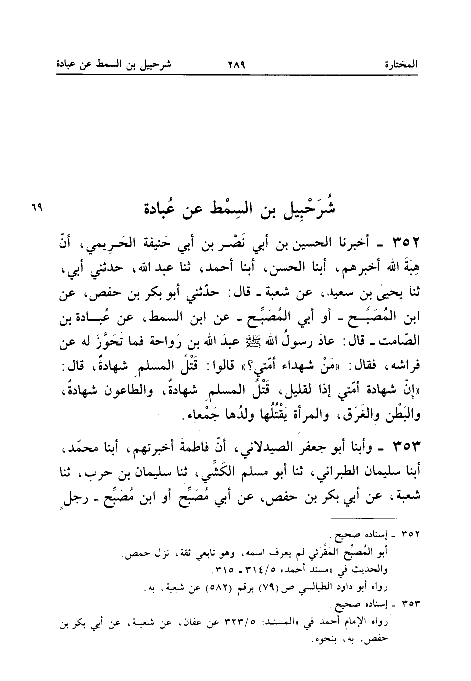 352 - أَخْبَرَنَا الْحُسَيْنُ بْنُ أَبِي نَصْرِ بِنْ أَبِي حَنِيفَةَ الْحَرِيمِيُّ أَنَّ هِبَةَ اللَّهِ أَخْبَرَهُمْ أبنا الْحسن أبنا أَحْمد ثَنَا عبد الله حَدَّثَنِي أَبِي ثَنَا يَحْيَى بْنُ سَعِيدٍ عَنْ شُعْبَةَ قَالَ حَدَّثَنِي أَبُو بَكْرِ بْنُ حَفْصٍ عَنِ ابْنِ الْمُصَبِّحِ أَوْ أَبِي الْمُصَبِّحِ عَنِ ابْنِ السِّمْطِ عَنْ عُبَادَةَ بْنِ الصَّامِتِ قَالَ عَادَ رَسُولُ اللَّهِ صَلَّى اللَّهُ عَلَيْهِ وَسَلَّمَ عبد الله بْنَ رَوَاحَةَ فَمَا تَحَوَزَ لَهُ عَنْ فِرَاشِهِ فَقَالَ (مَنْ شُهَدَاءُ أُمَّتِي) قَالُوا قَتْلُ الْمُسْلِمِ شَهَادَةٌ قَالَ (إِنَّ شَهَادَةَ أُمَّتِي إِذًا لَقَلِيلٌ قَتْلُ الْمُسْلِمِ شَهَادَةٌ وَالطَّاعُونُ شَهَادَةٌ وَالْبَطْنُ وَالْغَرَقُ وَالْمَرْأَة يَقْتُلهَا وَلَدهَا جَمْعَاء إِسْنَاده صَحِيح