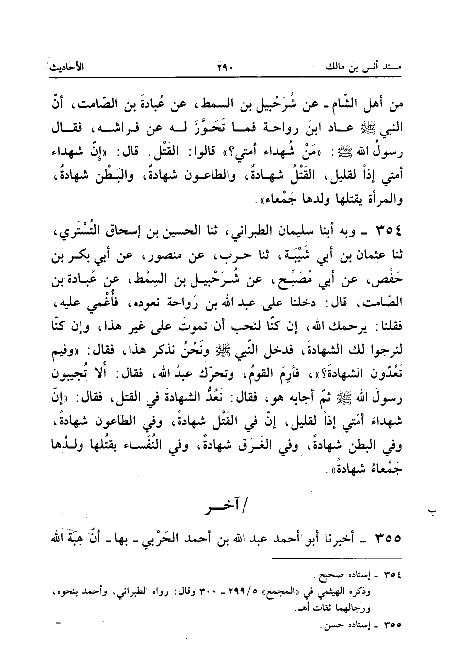 354 - وَبِهِ أبنا سُلَيْمَانُ الطَّبَرَانِيُّ ثَنَا الْحُسَيْنُ بْنُ إِسْحَاقَ التُّسْتَرِيُّ ثَنَا عُثْمَانُ بْنُ أَبِي شَيْبَةَ ثَنَا حَرْبٌ عَنْ مَنْصُورٍ عَنْ أَبِي بَكْرِ بْنِ حَفْصٍ عَنْ أَبِي مُصَبِّحٍ عَنْ شُرَحْبِيلَ بْنِ السِّمْطِ عَنْ عُبَادَةَ بْنِ الصَّامِتِ قَالَ دَخَلنَا على عبد الله بْنِ رَوَاحَةَ نَعُودُهُ فَأُغْمِيَ عَلَيْهِ فَقُلْنَا يَرْحَمُكَ اللَّهُ إِنْ كُنَّا لَنُحِبُّ أَنْ تَمُوتَ عَلَى غير هَذَا هَذَا وَإِنْ كُنَّا لَنَرْجُو لَكَ الشَّهَادَةَ فَدَخَلَ النَّبِيُّ صَلَّى اللَّهُ عَلَيْهِ وَسَلَّمَ وَنَحْنُ نَذْكُرُ هَذَا فَقَالَ (وَفِيمَ تَعُدُّونَ الشَّهَادَةَ) فَأَرِمَ الْقَوْمُ وتحرك عبد الله فَقَالَ أَلا تُجِيبُونَ رَسُولَ اللَّهِ صَلَّى اللَّهُ عَلَيْهِ وَسَلَّمَ ثُمَّ أَجَابَهُ هُوَ فَقَالَ نَعُدُّ الشَّهَادَةَ فِي الْقَتْلِ فَقَالَ (إِنَّ شُهَدَاءَ أُمَّتِي إِذًا لَقَلِيلٌ إِنَّ فِي الْقَتْلِ شَهَادَةٌ وَفِي الطَّاعُونِ شَهَادَةٌ وَفِي الْبَطْنِ شَهَادَةٌ وَفِي الْغَرَقِ شَهَادَةٌ وَفِي النَّفْسَاءِ يَقْتُلُهَا وَلَدُهَا جَمْعَاءُ شَهَادَةٌ)