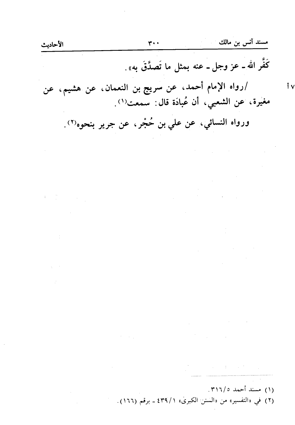 كَفَّرَ اللَّهُ عَزَّ وَجَلَّ عَنْهُ بِمِثْلِ مَا تَصَدَّقَ بِهِ) رَوَاهُ الإِمَامُ أَحْمَدُ عَنْ سُرَيْجِ بْنِ النُّعْمَانِ عَنْ هُشَيْمٍ عَنْ مُغِيرَةَ عَنِ الشَّعْبِيِّ أَنَّ عُبَادَةَ قَالَ سَمِعْتُ وَرَوَاهُ النَّسَائِيُّ عَنْ عَلِيِّ بْنِ حَجَرٍ عَنْ جَرِيرٍ بِنَحْوِهِ