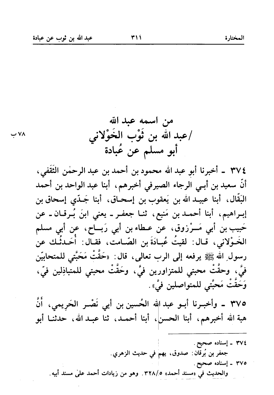 374 - أخبرنَا أَبُو عبد الله مَحْمُود بن أَحْمد بن عبد الرَّحْمَن الثَّقَفِيُّ أَنَّ سَعِيدَ بْنَ أَبِي الرَّجَاءِ الصَّيْرَفِيَّ أخْبرهُم أبنا عبد الْوَاحِد بن أَحْمد الْبَقَّال أبنا عبيد الله بْنُ يَعْقُوبَ بْنِ إِسْحَاقَ أبنا جَدِّي إِسْحَاقُ بْنُ إِبْرَاهِيمَ أبنا أَحْمَدُ بْنُ مَنِيعٍ ثَنَا جَعْفَرٌ يَعْنِي ابْنَ بُرْقَانَ عَنْ حَبِيبِ بْنِ أَبِي مَرْزُوقٍ عَنْ عَطَاءِ بْنِ أَبِي رَبَاحٍ عَنْ أَبِي مُسْلِمٍ الْخَوْلانِيِّ قَالَ لَقِيتُ عُبَادَةَ بْنَ الصَّامِتِ فَقَالَ أُحَدِّثُكَ عَنْ رَسُولِ اللَّهِ صَلَّى اللَّهُ عَلَيْهِ وَسَلَّمَ يَرْفَعُهُ إِلَى الرَّبِّ تَعَالَى قَالَ (حَقَّتْ مَحَبَّتِي لِلْمُتَحَابِّينَ فِيَّ وَحَقَّتْ مَحَبَّتِي لِلْمُتَزَاوِرِينَ فِيَّ وَحَقَّتْ مَحَبَّتِي لِلْمُتَبَاذِلِينَ فِيَّ وحقت محبتي للمتوصلين فِي) إِسْنَاده صَحِيح