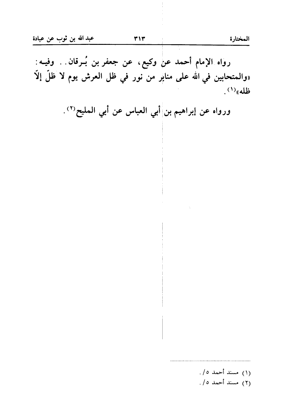 رَوَاهُ الإِمَامُ أَحْمَدُ عَنْ وَكِيعٍ عَنْ جَعْفَرِ بْنِ بُرْقَانَ وَفِيهِ (وَالْمُتَحَابِّينَ فِي اللَّهِ عَلَى مَنَابِرَ مِنْ نُورٍ فِي ظِلِّ الْعَرْشِ يَوْمَ لَا ظلّ لاظله) وَرَوَاهُ عَنْ إِبْرَاهِيمَ بْنِ أَبِي الْعَبَّاسِ عَنْ أبي الْمليح
