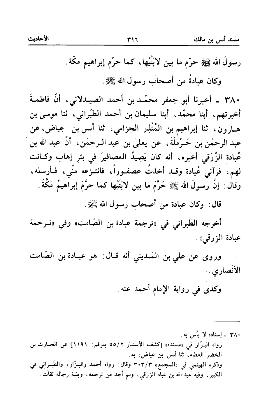 380 - أَخْبَرَنَا أَبُو جَعْفَرٍ مُحَمَّدُ بْنُ أَحْمَدَ الصَّيْدَلانِيُّ أَنَّ فَاطِمَةَ أَخْبَرَتْهُمْ أبنا مُحَمَّدٌ أبنا سُلَيْمَانُ بْنُ أَحْمَدَ الطَّبَرَانِيُّ ثَنَا مُوسَى بْنُ هَارُونَ ثَنَا إِبْرَاهِيمُ بْنُ الْمُنْذِرِ الْحِزَامِيُّ ثَنَا أَنَسُ بن عِيَاض عَن عبد الرَّحْمَن بن حَرْمَلَة عَن يعلى بن عبد الرَّحْمَن أَن عبد الله بْنَ عُبَادَةَ الزُّرْقِيَّ أَخْبَرَهُ أَنَّهُ كَانَ يَصِيدُ الْعَصَافِيرَ فِي بِئْرِ أَبِي إِهَابٍ وَكَانَتْ لَهُمْ فَرَآنِي عُبَادَةُ وَقَدْ أَخَذْتُ عُصْفُورًا فَانْتَزَعَهُ مِنِّي فَأَرْسَلَهُ وَقَالَ إِنَّ رَسُولَ اللَّهِ صَلَّى اللَّهُ عَلَيْهِ وَسَلَّمَ حَرَّمَ مَا بَيْنَ لابَتَيْهَا كَمَا حَرَّمَ إِبْرَاهِيمُ مَكَّةَ وَكَانَ عُبَادَةُ مِنْ أَصْحَابِ رَسُولِ اللَّهِ صَلَّى اللَّهُ عَلَيْهِ وَسَلَّمَ أَخْرَجَهُ الطَّبَرَانِيُّ فِي (تَرْجَمَةِ عُبَادَةَ بْنِ الصَّامِتِ) وَفِي (تَرْجَمَة عبَادَة الزرقي) وروى عَن عَليّ بن الْمَدِينِيِّ أَنَّهُ قَالَ هُوَ عُبَادَةُ بْنُ الصَّامِتِ الْأنْصَارِيّ وكذى فِي رِوَايَة الإِمَام أَحْمد عَنهُ