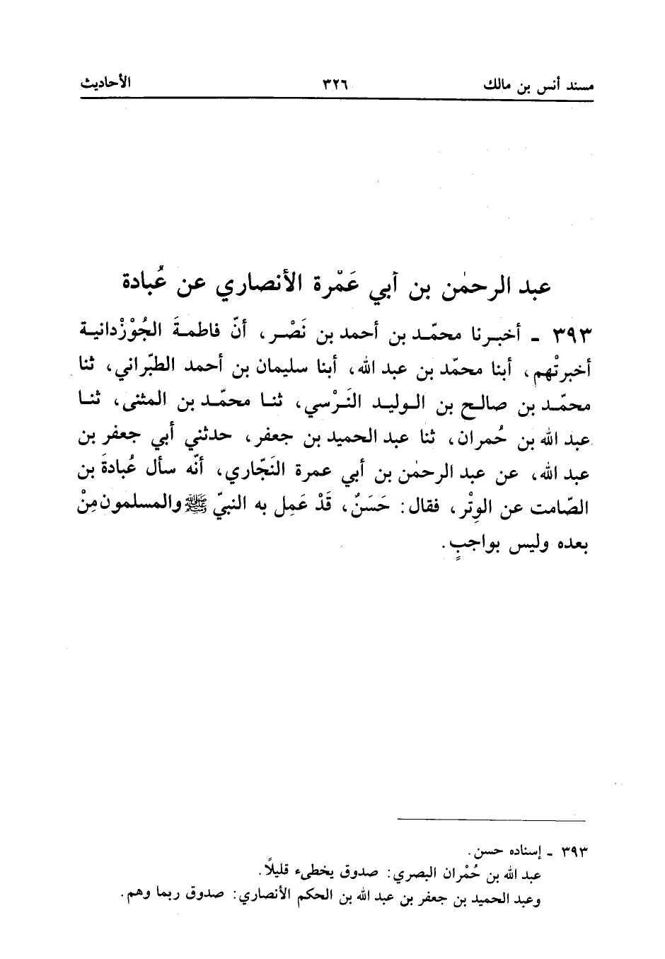 393 - أَخْبَرَنَا مُحَمَّدُ بْنُ أَحْمَدَ بْنِ نَصْرٍ أَنَّ فَاطِمَة الجوزدانية أَخْبَرتهم أبنا مُحَمَّد بن عبد الله أبنا سُلَيْمَانُ بْنُ أَحْمَدَ الطَّبَرَانِيُّ ثَنَا مُحَمَّدُ بْنُ صَالِحِ بْنِ الْوَلِيدِ النَّرْسِيُّ ثَنَا مُحَمَّدُ بن المثني ثَنَا عبد الله بن حمْرَان ثَنَا عبد الحميد بن جَعْفَر حَدثنِي أبي جَعْفَر بن عبد الله عَن عبد الرَّحْمَن بْنِ أَبِي عَمْرَةَ النَّجَّارِيِّ أَنَّهُ سَأَلَ عُبَادَةَ بْنَ الصَّامِتِ عَنِ الْوِتْرِ فَقَالَ حَسَنٌ قَدْ عَمَلَ بِهِ النَّبِيُّ صَلَّى اللَّهُ عَلَيْهِ وَسَلَّمَ وَالْمُسْلِمُونَ مِنْ بَعْدِهِ وَلَيْسَ بِوَاجِبٍ