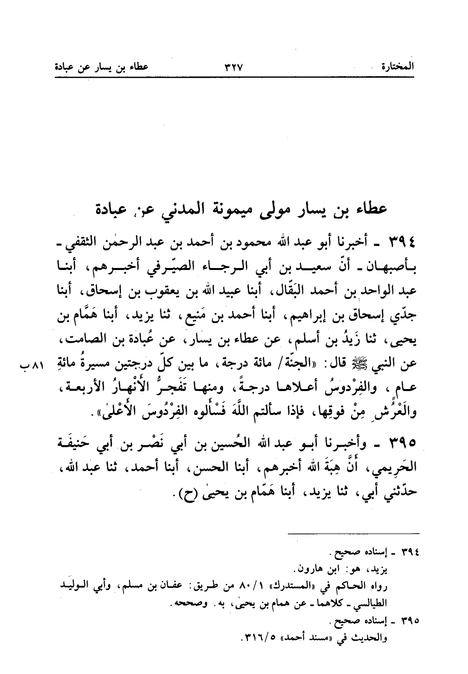 394 - أخبرنَا أَبُو عبد الله مَحْمُود بن أَحْمد بن عبد الرَّحْمَن الثَّقَفِيُّ بِأَصْبَهَانَ أَنَّ سَعِيدَ بْنَ أَبِي الرَّجَاءِ الصَّيْرَفِي أخْبرهُم أبنا عبد الْوَاحِد بن أَحْمد الْبَقَّال أبنا عبيد الله بْنُ يَعْقُوبَ بْنِ إِسْحَاقَ أبنا جَدِّي إِسْحَاقُ بْنُ إِبْرَاهِيمَ أبنا أَحْمَدُ بْنُ مَنِيعٍ ثَنَا يَزِيدُ أبنا هَمَّامُ بْنُ يَحْيَى ثَنَا زَيْدُ بْنِ أَسْلَمَ عَنْ عَطَاءِ بْنِ يَسَارٍ عَنْ عُبَادَةَ بْنِ الصَّامِتِ عَنِ النَّبِيِّ صَلَّى اللَّهُ عَلَيْهِ وَسَلَّمَ قَالَ (الْجَنَّةُ مِائَةُ دَرَجَةٍ مَا بَيْنَ كُلِّ دَرَجَتَيْنِ مَسِيرَةُ مِائَةِ عَامٍ وَالْفِرْدَوْسُ أَعْلاهَا دَرَجَةً وَمِنْهَا تَفَجَّرُ الأَنْهَارُ الأَرْبَعَةُ وَالْعَرْشُ مِنْ فَوْقِهَا فَإِذَا سَأَلْتُمُ اللَّهَ فَاسْأَلُوهُ الْفِرْدَوْسَ الْأَعْلَى) إِسْنَاده صَحِيح