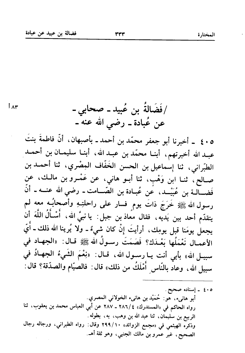 405 - أَخْبَرَنَا أَبُو جَعْفَرٍ مُحَمَّدُ بْنُ أَحْمَدَ بْنِ نصر بأصبهان أَن فَاطِمَة بنت عبد الله أَخْبَرتهم أبنا مُحَمَّد بن عبد الله أبنا سُلَيْمَانُ بْنُ أَحْمَدَ الطَّبَرَانِيُّ ثَنَا إِسْمَاعِيلُ بْنُ الْحَسَنِ الْخَفَّافُ الْمِصْرِيُّ ثَنَا أَحْمَدُ بْنُ صَالِحٍ ثَنَا ابْنُ وَهْبٍ ثَنَا أَبُو هَانِي عَنْ عَمْرِو بْنِ مَالِكٍ عَنْ فَضَالَةَ بْنِ عُبَيْدٍ عَنْ عُبَادَةَ بْنِ الصَّامِتِ رَضِيَ اللَّهُ عَنْهُ أَنَّ رَسُولَ اللَّهِ صَلَّى اللَّه عَلَيْهِ وَسَلَّمَ خَرَجَ ذَاتَ يَوْمٍ فَسَارَ عَلَى رَاحِلَتِهِ وَأَصْحَابُهُ مَعَهُ لَمْ يَتَقَدَّمْ أَحَدٌ بَيْنَ يَدَيْهِ فَقَالَ مُعَاذُ بْنُ جَبَلٍ يَا نَبِيَّ اللَّهِ أَسْأَلُ اللَّهَ أَنْ يَجْعَلَ يَوْمَنَا قَبْلَ يَوْمَكَ أَرَأَيْتَ إِنْ كَانَ شَيْءٌ وَلا يُرِينَا اللَّهُ ذَلِكَ أَيُّ الأَعْمَالِ نَعْمَلُهَا بَعْدَكَ فَصَمَتَ رَسُولُ اللَّهِ صَلَّى اللَّهُ عَلَيْهِ وَسَلَّمَ قَالَ (الْجِهَادُ فِي سَبِيلِ اللَّهِ) بِأَبِي أَنْتَ يَا رَسُولَ اللَّهِ قَالَ (نِعْمَ الشَّيْءُ الْجِهَادُ فِي سَبِيلِ اللَّهِ وَعَادَ بِالنَّاسِ أَمْلَكُ مِنْ ذَلِكَ) قَالَ فَالصِّيَامُ وَالصَّدَقَةُ قَالَ
