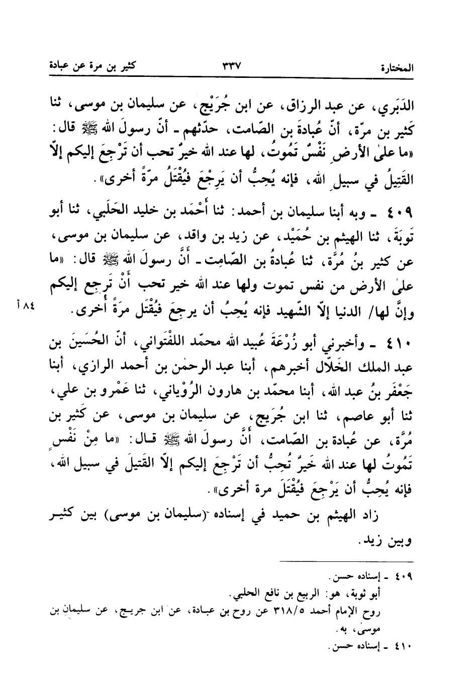 409 - وَبِهِ أبنا سُلَيْمَانُ بْنُ أَحْمَدَ ثَنَا أَحْمَدُ بْنُ خُلَيْدٍ الْحَلَبِيُّ ثَنَا أَبُو تَوْبَةَ ثَنَا الْهَيْثَمُ بْن حُمَيْدٍ عَنْ زَيْدِ بْنِ وَاقِدٍ عَنْ سُلَيْمَانَ بْنِ مُوسَى عَنْ كَثِيرِ بْنِ مُرَّةَ ثَنَا عُبَادَةُ بْنُ الصَّامِتِ أَنَّ رَسُولَ اللَّهِ صَلَّى اللَّهُ عَلَيْهِ وَسَلَّمَ قَالَ (مَا عَلَى الأَرْضِ مِنْ نَفْسٍ تَمُوتُ وَلَهَا عِنْدَ اللَّهِ خَيْرٌ تُحِبُّ أَنْ تَرْجِعَ إِلَيْكُمْ وَإِنَّ لَهَا الدُّنْيَا إِلا الشَّهِيدُ فَإِنَّهُ يُحِبُّ أَنْ يرجع فَيقْتل مرّة أُخْرَى إِسْنَاده حسن