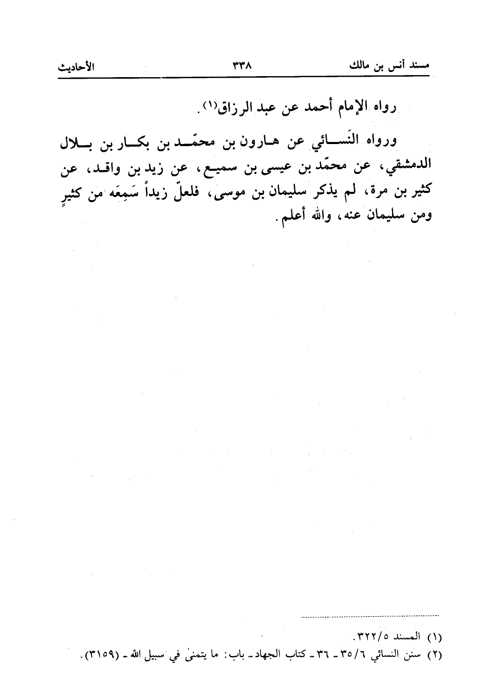 رَوَاهُ الإِمَام أَحْمد عَن عبد الرَّزَّاق وَرَوَاهُ النَّسَائِيُّ عَنْ هَارُونَ بْنِ مُحَمَّدِ بْنِ بَكَّارِ بْنِ بِلالٍ الدِّمَشْقِيِّ عَنْ مُحَمَّدِ بْنِ عِيسَى بْنِ سُمَيْعٍ عَنْ زَيْدِ بْنِ وَاقِدٍ عَنْ كَثِيرِ بْنِ مُرَّةَ لَمْ يَذْكُرْ سُلَيْمَانَ بْنِ مُوسَى فَلَعَلَّ زَيْدًا سَمِعَهُ مِنْ كَثِيرٍ وَمِنْ سُلَيْمَانَ عَنْهُ وَاللَّهُ أَعْلَمُ
