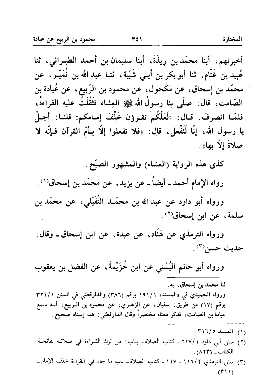 أَخْبَرَتْهُمْ أبنا مُحَمَّدُ بْنُ رِيذَةَ أبنا سُلَيْمَانُ بْنُ أَحْمَدَ الطَّبَرَانِيُّ ثَنَا عُبَيْدُ بْنُ غَنَّامٍ ثَنَا أَبُو بَكْرِ بْنُ أَبِي شَيْبَةَ ثَنا عبد الله بْنُ نُمَيْرٍ عَنْ مُحَمَّدِ بْنِ إِسْحَاقَ عَنْ مَكْحُولٍ عَنْ مَحْمُودِ بْنِ الرَّبِيعِ عَنْ عُبَادَةَ بْنِ الصَّامِتِ قَالَ صَلَّى رَسُولُ اللَّهِ صَلَّى اللَّهُ عَلَيْهِ وَسَلَّمَ الْعِشَاءَ فَثَقُلَتْ عَلَيْهِ الْقِرَاءَةُ فَلَمَّا انْصَرف قَالَ (لَعَلَّكُمْ تقرؤن خَلْفَ إِمَامِكُمْ) قُلْنَا أَجَلْ يَا رَسُولَ اللَّهِ إِنَّا لَنَفْعَلْ قَالَ (فَلا تَفْعَلُوا إِلا بِأُمِّ الْقُرْآن فَإِنَّهُ لَا صَلَاة إِلَّا بهَا) كذى هَذِهِ الرِّوَايَةُ (الْعِشَاءَ) وَالْمَشْهُورُ الصُّبْحُ رَوَاهُ الإِمَامُ أَحْمَدُ أَيْضًا عَنْ يَزِيدَ عَنْ مُحَمَّدِ بْنِ إِسْحَاق وَرَوَاهُ أَبُو دَاوُد عَن عبد الله بْنِ مُحَمَّدٍ النُّفَيْلِيِّ عَنْ مُحَمَّدِ بْنِ سَلَمَةَ عَنِ ابْنِ إِسْحَاقَ وَرَوَاهُ التِّرْمِذِيُّ عَنْ هَنَّادٍ عَنْ عَبْدَةَ عَنِ ابْنِ إِسْحَاقَ وَقَالَ حَدِيثٌ حَسَنٌ وَرَوَاهُ أَبُو حَاتِمٍ الْبُسْتِيُّ عَنِ ابْنِ خُزَيْمَةَ عَنِ الْفَضْلِ بْنِ يَعْقُوبَ