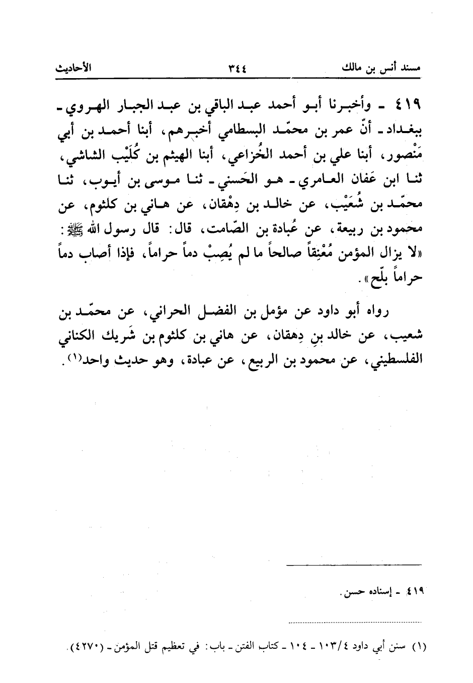 419 - وَأخْبرنَا أَبُو أَحْمد عبد الْبَاقِي بن عبد الْجَبَّار الْهَرَوِيُّ بِبَغْدَادَ أَنَّ عُمَرَ بْنَ مُحَمَّدٍ الْبَسْطَامِيَّ أَخْبَرَهُمْ أبنا أَحْمَدُ بْنُ أَبِي مَنْصُورٍ أبنا عَلِيُّ بْنُ أَحْمَدَ الْخُزَاعِيُّ أبنا الْهَيْثَمُ بْنُ كُلَيْبٍ الشَّاشِيُّ ثَنَا ابْنُ عَفَّانَ الْعَامِرِيُّ هُوَ الْحَسَنِيُّ ثَنَا مُوسَى بْنُ أَيُّوبَ ثَنَا مُحَمَّدُ بْنُ شُعَيْبٍ عَنْ خَالِدِ بْنِ دِهْقَانَ عَنْ هَانِي بْنِ كُلْثُومٍ عَنْ مَحْمُودِ بْنِ رَبِيعَةَ عَنْ عُبَادَةَ بْنِ الصَّامِتِ قَالَ قَالَ رَسُولُ اللَّهِ صَلَّى اللَّه عَلَيْهِ وَسَلَّمَ (لَا يَزَالُ الْمُؤْمِنُ مُعْنِقًا صَالِحًا مَا لَمْ يُصِبْ دَمًا حَرَامًا فَإِذَا أَصَابَ دَمًا حَرَامًا بَلَّحَ) رَوَاهُ أَبُو دَاوُدَ عَنْ مُؤَمَّلِ بْنِ الْفَضْلِ الْحَرَّانِيِّ عَنْ مُحَمَّدِ بْنِ شُعَيْبٍ عَنْ خَالِدِ بْنِ دِهْقَانَ عَنْ هَانِي بْنِ كُلْثُومِ بْنِ شَرِيكٍ الْكِنَانِيِّ الْفَلَسْطِينِيِّ عَنْ مَحْمُودِ بْنِ الرَّبِيعِ عَنْ عُبَادَةَ وَهُوَ حَدِيثٌ وَاحِدٌ