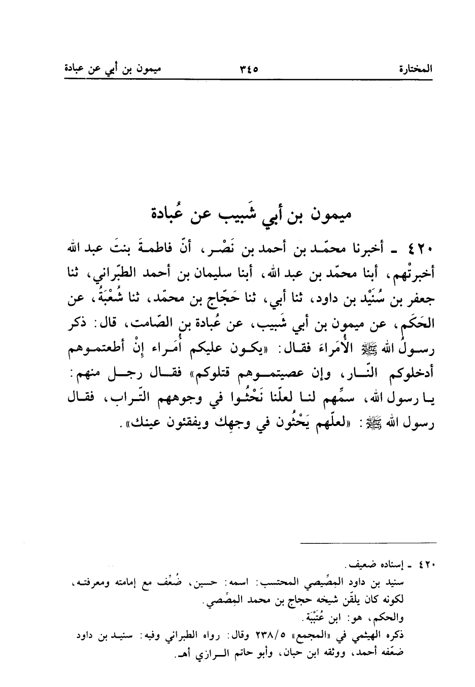 420 - أَخْبَرَنَا أَبُو جَعْفَرٍ مُحَمَّدُ بْنُ أَحْمَدَ بْنِ نصر أَن فَاطِمَة بنت عبد الله أَخْبَرتهم أبنا مُحَمَّد بن عبد الله أبنا سُلَيْمَانُ بْنُ أَحْمَدَ الطَّبَرَانِيُّ ثَنَا جَعْفَرُ بْنُ سُنَيْدِ بْنِ دَاوُدَ ثَنَا أَبِي ثَنَا حَجَّاجُ بْنُ مُحَمَّدٍ ثَنَا شُعْبَةُ عَنِ الْحَكَمِ عَنْ مَيْمُونِ بْنِ أَبِي شَبِيبٍ عَنْ عُبَادَةَ بْنِ الصَّامِتِ قَالَ ذَكَرَ رَسُولُ اللَّهِ صَلَّى اللَّهُ عَلَيْهِ وَسَلَّمَ الأُمَرَاءَ فَقَالَ (يَكُونُ عَلَيْكُمْ أُمَرَاءُ إِنْ أَطَعْتُمُوهُمْ أَدْخَلُوكُمُ النَّارَ وَإِنْ عَصَيْتُمُوهُمْ قَتَلُوكُمْ) فَقَالَ رَجُلٌ مِنْهُمْ يَا رَسُولَ اللَّهِ سَمِّهُمْ لَنَا لَعَلَّنَا نَحْثُوا فِي وُجُوهِهِمُ التُّرَابَ فَقَالَ رَسُولُ اللَّهِ صَلَّى اللَّهُ عَلَيْهِ وَسَلَّمَ (لَعَلَّهُمْ يَحْثُونَ فِي وَجْهِكَ وَيَفْقَئُونَ عَيْنَكَ)