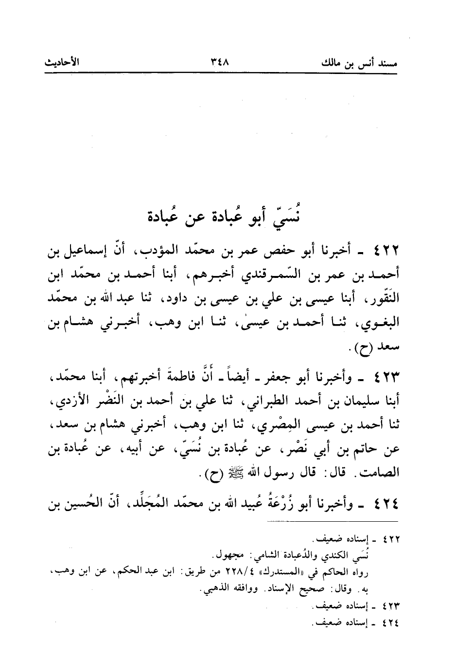 422 - أَخْبَرَنَا أَبُو حَفْصٍ عُمَرُ بْنُ مُحَمَّدٍ الْمُؤَدِّبُ أَنَّ إِسْمَاعِيلَ بْنَ أَحْمَدَ بْنِ عُمَرَ السَّمَرْقَنْدِيَّ أَخْبَرَهُمْ أبنا أَحْمَدُ بْنُ مُحَمَّدِ بْنِ النَّقُّورِ أبنا عِيسَى بْنُ عَلِيِّ بْنِ عِيسَى بْنِ دَاوُد ثَنَا عبد الله بْنُ مُحَمَّدٍ الْبَغَوِيُّ ثَنَا أَحْمَدُ بْنُ عِيسَى ثَنَا ابْنُ وَهْبٍ أَخْبَرَنِي هِشَامُ بْنُ سَعْدٍ (ح) إِسْنَاده ضَعِيف