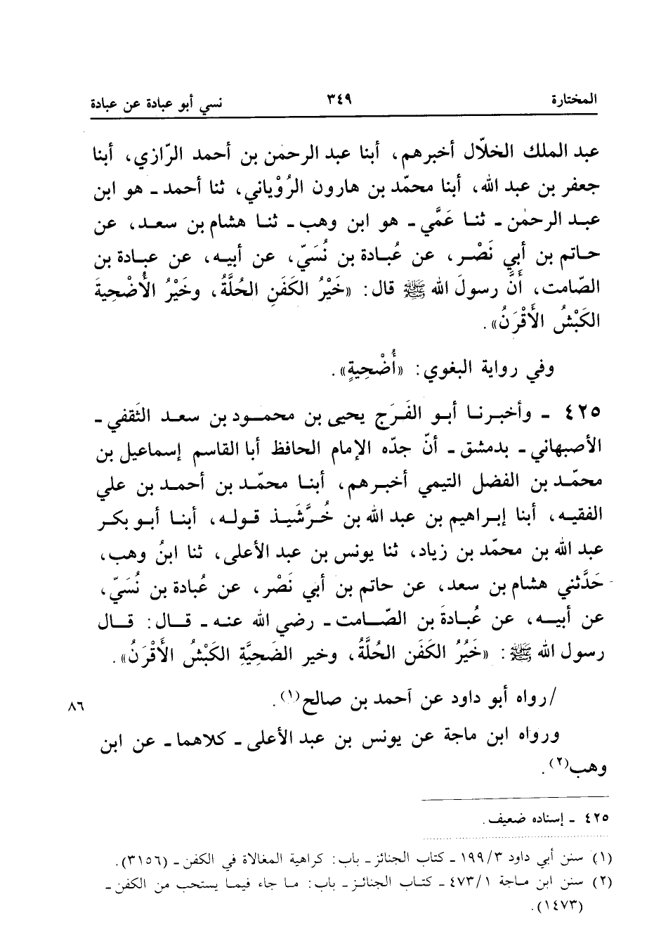 425 - وَأَخْبَرَنَا أَبُو الْفَرَجِ يَحْيَى بْنُ مَحْمُودِ بْنِ سَعْدٍ الثَّقَفِيُّ الأَصْبَهَانِيُّ بِدِمَشْقَ أَنَّ جِدَّهُ الإِمَامَ الْحَافِظَ أَبَا الْقَاسِمِ إِسْمَاعِيلَ بْنَ مُحَمَّدِ بْنِ الْفَضْلِ التَّيْمِيَّ أَخْبَرَهُمْ أبنا مُحَمَّدُ بْنُ أَحْمَدَ بن عَليّ الْفَقِيه أبنا إِبْرَاهِيم بن عبد الله بن خرشيذ قَوْله أبنا أَبُو بكر عبد الله بْنُ مُحَمَّدِ بْنِ زِيَادٍ ثَنَا يُونُسُ بْنُ عَبْدِ الأَعْلَى ثَنَا ابْنُ وَهْبٍ حَدَّثَنِي هِشَامُ بْنُ سَعْدٍ عَنْ حَاتِمِ بْنِ أَبِي نَصْرٍ عَنْ عُبَادَةَ بْنِ نُسَيٍّ عَنْ أَبِيهِ عَنْ عُبَادَةَ بْنِ الصَّامِتِ رَضِيَ اللَّهُ عَنْهُ قَالَ قَالَ رَسُولُ اللَّهِ صَلَّى اللَّهُ عَلَيْهِ وَسَلَّمَ (خَيْرُ الْكَفَنِ الْحُلَّةُ وَخَيْرُ الأُضْحِيَةُ الْكَبْشُ الأَقْرَنُ) رَوَاهُ أَبُو دَاوُدَ عَنْ أَحْمَدَ بْنِ صَالِحٍ وَرَوَاهُ ابْن ماجة عَن يُونُس بن عبد الْأَعْلَى كِلاهُمَا عَنِ ابْنِ وَهْبٍ