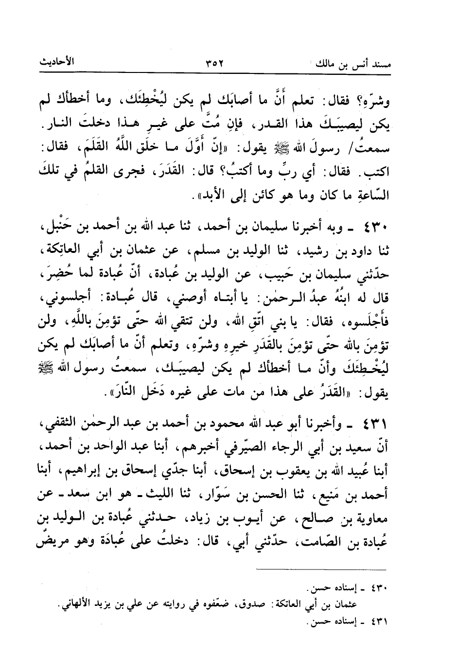 430 - وَبِه أخبرنَا سُلَيْمَان بن أَحْمد ثَنَا عبد الله بْنُ أَحْمَدَ بْنِ حَنْبَلٍ ثَنَا دَاوُدُ بْنُ رُشَيْدٍ ثَنَا الْوَلِيدُ بْنُ مُسْلِمٍ عَنْ عُثْمَانَ بْنِ أَبِي الْعَاتِكَةَ حَدَّثَنِي سُلَيْمَانُ بْنُ حَبِيبٍ عَنِ الْوَلِيدِ بْنِ عُبَادَةَ أَنَّ عُبَادَةَ لَمَّا حضر قَالَ لَهُ ابْنه عبد الرَّحْمَن يَا أَبَتَاهُ أَوْصِنِي قَالَ عُبَادَةُ أَجْلِسُونِي فَأَجْلَسُوهُ فَقَالَ يَا بُنَيَّ اتَّقِ اللَّهَ وَلَنْ تَتَّقِيَ اللَّهَ حَتَّى تُؤْمِنَ بِاللَّهِ وَلَنْ تُؤْمِنَ بِاللَّهِ حَتَّى تُؤْمِنَ بِالْقَدَرِ خَيْرِهِ وَشَرِّهِ وَتَعْلَمَ أَنَّ مَا أَصَابَكَ لَمْ يَكُنْ لِيُخْطَئَكَ وَأَنَّ مَا أَخْطَأَكَ لَمْ يَكُنْ لِيُصِيبَكَ سَمِعْتُ رَسُولَ اللَّهِ صَلَّى اللَّهُ عَلَيْهِ وَسَلَّمَ يَقُولُ (الْقَدَرُ عَلَى هَذَا مَنْ مَاتَ عَلَى غَيْرِهِ دَخَلَ النَّارَ) إِسْنَاده حسن