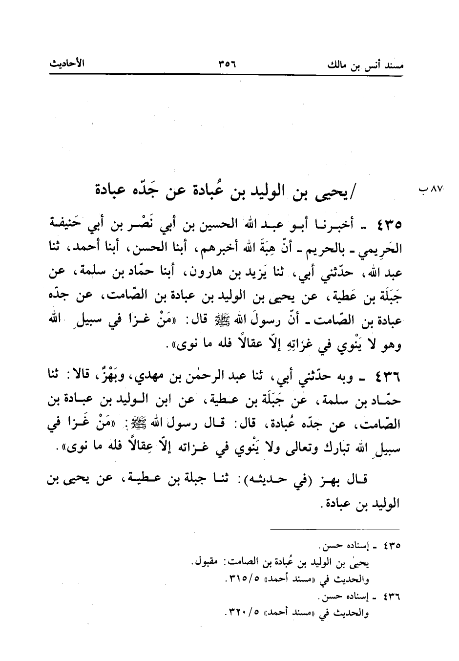436 - وَبِه حَدثنِي أبي ثَنَا عبد الرَّحْمَن بْنُ مَهْدِيٍّ وَبَهْزٌ قَالا ثَنَا حَمَّادُ بْنُ سَلَمَةَ عَنْ جَبَلَةَ بْنِ عَطِيَّةَ عَنِ ابْنِ الْوَلِيدِ بْنِ عُبَادَةَ بْنِ الصَّامِتِ عَنْ جَدِّهِ عُبَادَةَ قَالَ قَالَ رَسُولُ اللَّهِ صَلَّى اللَّهُ عَلَيْهِ وَسَلَّمَ قَالَ (مَنْ غَزَا فِي سَبِيلِ اللَّهِ تَبَارَكَ وَتَعَالَى وَلا يَنْوِي فِي غَزَاتِهِ إِلا عِقَالا فَلَهُ مَا نَوَى) قَالَ بَهْزٌ (فِي حَدِيثِهِ) ثَنَا جَبَلَةُ بْنُ عَطِيَّةَ عَنْ يحيى بن الْوَلِيد بن عبَادَة إِسْنَاده حسن