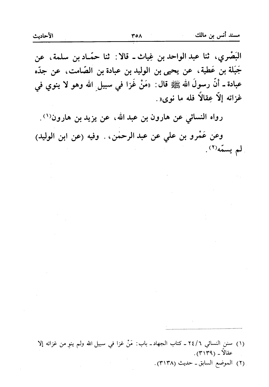 الْبَصْرِيّ ثَنَا عبد الْوَاحِد بْنُ غِيَاثٍ قَالا ثَنَا حَمَّادُ بْنُ سَلَمَةَ عَنْ جَبَلَةَ بْنِ عَطِيَّةَ عَنْ يَحْيَى بْنِ الْوَلِيدِ بْنِ عُبَادَةَ بْنِ الصَّامِتِ عَنْ جَدِّهِ عُبَادَةَ أَنَّ رَسُولَ اللَّهِ صَلَّى اللَّهُ عَلَيْهِ وَسَلَّمَ قَالَ (مَنْ غَزَا فِي سَبِيلِ اللَّهِ وَهُوَ لَا يَنْوِي فِي غَزَاتِهِ إِلا عِقَالا فَلَهُ مَا نَوَى) رَوَاهُ النَّسَائِيُّ عَنْ هَارُونَ بن عبد الله عَنْ يَزِيدَ بْنِ هَارُونَ وَعَنْ عَمْرِو بْنِ عَليّ بن عبد الرَّحْمَن وَفِيهِ (عَنِ ابْنِ الْوَلِيدِ) لَمْ يُسَمِّهِ