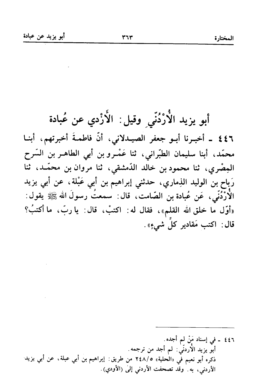 446 - أَخْبَرَنَا أَبُو جَعْفَرٍ الصَّيْدَلانِيُّ أَنَّ فَاطِمَةَ أَخْبَرَتْهُمْ أبنا مُحَمَّدٌ أبنا سُلَيْمَانُ الطَّبَرَانِيُّ ثَنَا عَمْرُو بْنُ أَبِي الطَّاهِرِ بْنِ السَّرْحِ الْمِصْرِيُّ ثَنَا مَحْمُودُ بْنُ خَالِدٍ الدِّمَشْقِيُّ ثَنَا مَرْوَانُ بْنُ مُحَمَّدٍ ثَنَا رَبَاحُ بْنُ الْوَلِيدِ الذِّمَارِيُّ حَدَّثَنِي إِبْرَاهِيمُ بْنُ أَبِي عَبْلَةَ عَنْ أَبِي يَزِيدَ الأُرْدُنِيِّ عَنْ عُبَادَةَ بْنِ الصَّامِتِ قَالَ سَمِعْتُ رَسُولَ اللَّهِ صَلَّى اللَّهُ عَلَيْهِ وَسَلَّمَ يَقُولُ (أَوَلَ مَا خَلَقَ اللَّهُ الْقَلَمَ) فَقَالَ لَهُ اكْتُبْ قَالَ يَا رَبِّ مَا أَكْتُبُ قَالَ اكْتُبْ مَقَادِيرَ كُلِّ شَيْءٍ)