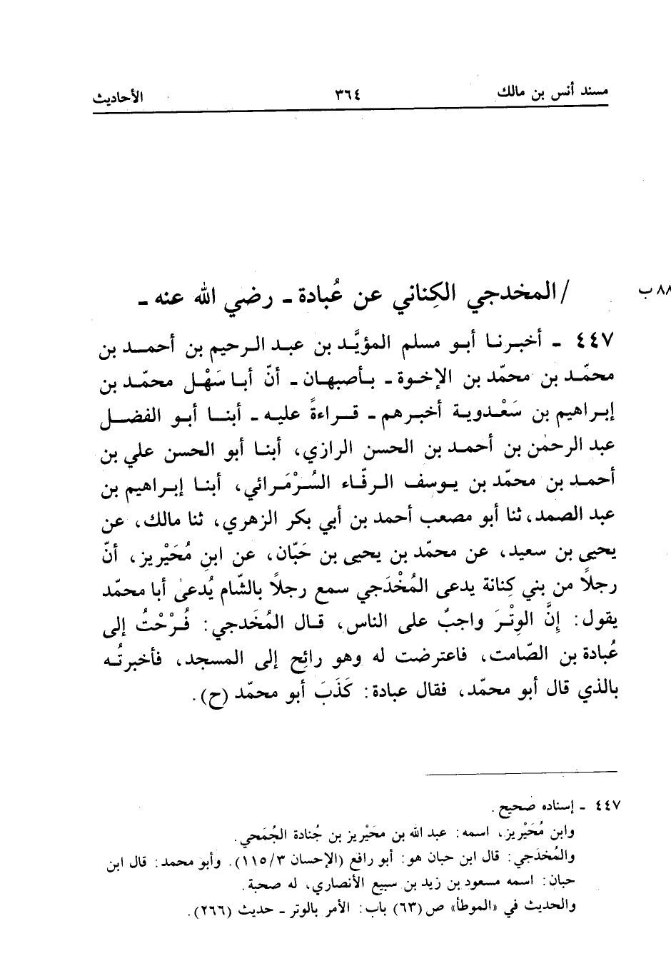 447 - أخبرنَا أَبُو مُسلم الْمُؤَيد بن عبد الرَّحِيم بْنِ أَحْمَدَ بْنِ مُحَمَّدِ بْنِ مُحَمَّدِ بْنِ الإِخْوَةِ بِأَصْبَهَانَ أَنَّ أَبَا سَهْلٍ مُحَمَّدَ بْنَ إِبْرَاهِيمَ بْنِ سَعْدَوَيْهِ أَخْبَرَهُمْ قِرَاءَةً عَلَيْهِ أبنا أَبُو الْفضل عبد الرَّحْمَن بْنُ أَحْمَدَ بْنِ الْحَسَنِ الرَّازِيُّ أبنا أَبُو الْحَسَنِ عَلِيُّ بْنُ أَحْمَدَ بْنِ مُحَمَّدِ بْنِ يُوسُف الرفاء السرمرائي أبنا إِبْرَاهِيم بن عبد الصَّمد ثَنَا أَبُو مُصْعَبٍ أَحْمَدُ بْنُ أَبِي بَكْرٍ الزُّهْرِيُّ ثَنَا مَالِكٌ عَنْ يَحْيَى بْنِ سَعِيدٍ عَنْ مُحَمَّدِ بْنِ يَحْيَى بْنِ حِبَّانَ عَنِ ابْنِ مُحَيْرِيزٍ أَنَّ رَجُلا مِنْ بَنِي كِنَانَةَ يُدْعَى الْمَخْدَجِيَّ سَمِعَ رَجُلا بِالشَّامِ يُدْعَى أَبَا مُحَمَّدٍ يَقُولُ إِنَّ الْوِتْرَ وَاجِبٌ عَلَى النَّاسِ قَالَ الْمَخْدَجِيُّ فَرُحْتُ إِلَى عُبَادَةَ بْنِ الصَّامِتِ فَاعْتَرَضْتُ لَهُ وَهُوَ رَائِحٌ إِلَى الْمَسْجِدِ فَأَخْبَرْتُهُ بِالَّذِي قَالَ أَبُو مُحَمَّدٍ فَقَالَ عُبَادَةُ كَذَبَ أَبُو مُحَمَّد (ح)