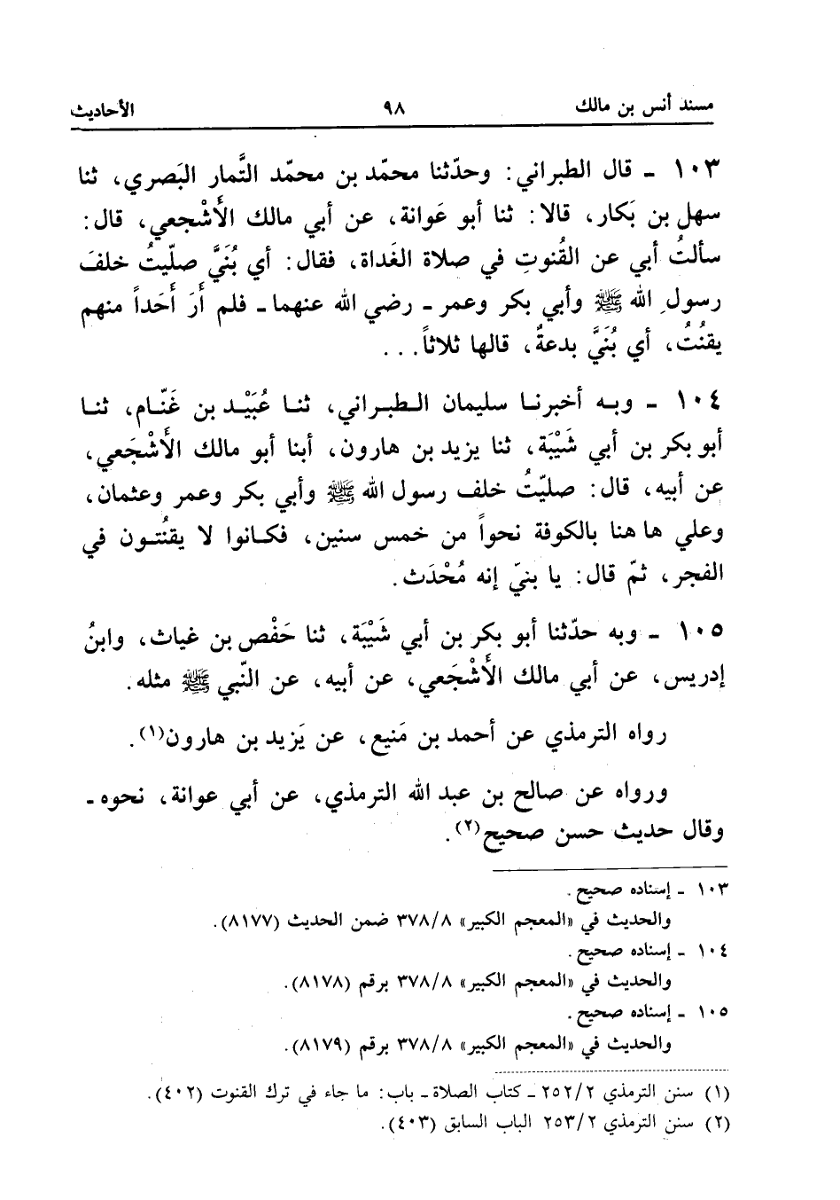 103 - قَالَ الطَّبَرَانِيُّ وَحَدَّثنا مُحَمَّدُ بْنُ مُحَمَّدٍ التَّمَّارُ الْبَصْرِيُّ ثَنَا سَهْلُ بْنُ بَكَّارٍ قَالا ثَنَا أَبُو عَوَانَةَ عَنْ أَبِي مَالِكٍ الأَشْجَعِيِّ قَالَ سَأَلْتُ أَبِي عَنِ الْقُنُوتِ فِي صَلاةِ الْغَدَاةِ فَقَالَ أَيْ بُنَيَّ صَلَّيْتُ خَلْفَ رَسُولِ اللَّهِ صَلَّى اللَّهُ عَلَيْهِ وَسَلَّمَ وَأَبِي بَكْرٍ وَعُمَرَ رَضِيَ اللَّهُ عَنْهُمَا فَلَمْ أَرَ أَحَدًا مِنْهُمْ يقنت أَي بني بِدعَة قَالَهَا ثَلَاثًا إِسْنَاده صَحِيح