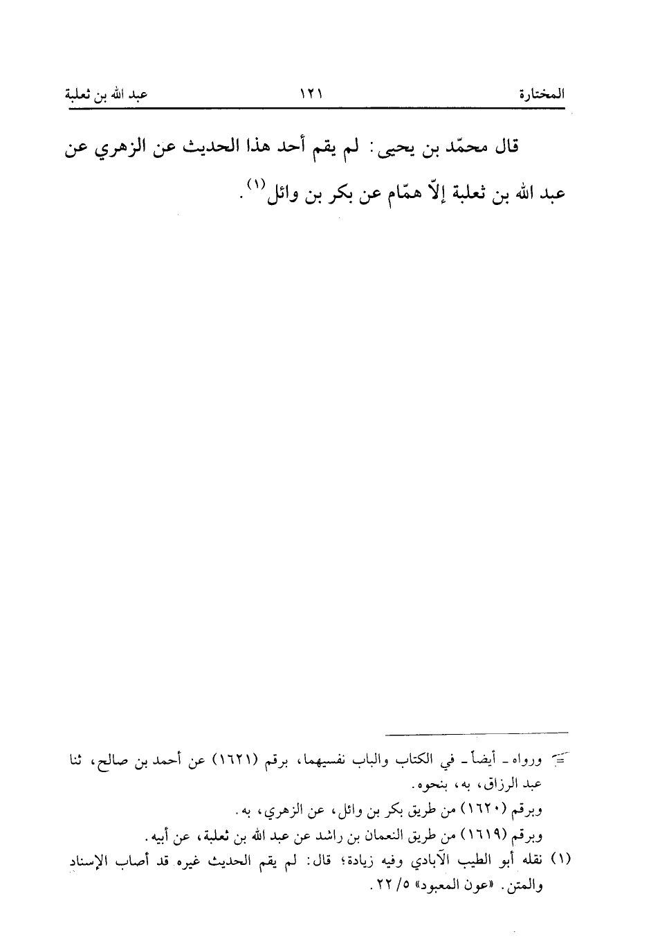 قَالَ مُحَمَّد بن يحيى لم يقم أَحْمد هَذَا الْحَدِيثَ عَنِ الزُّهْرِيِّ عَنْ عَبْدِ اللَّهِ بْنِ ثَعْلَبَةَ إِلا هَمَّامٌ عَنْ بَكْرِ بْنِ وَائِل
