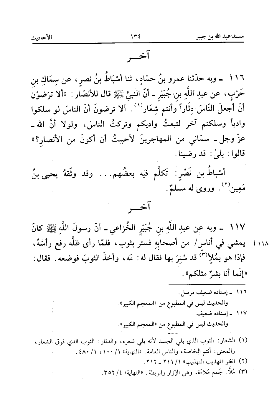 116 - وَبِهِ حَدَّثَنَا عَمْرُو بْنُ حَمَّادٍ ثَنَا أَسْبَاطُ بْنُ نَصْرٍ عَنْ سِمَاكِ بْنِ حَرْبٍ عَنْ عَبْدِ اللَّهِ بْنِ جُبَيْرٍ أَنَّ النَّبِيَّ صَلَّى اللَّهُ عَلَيْهِ وَسَلَّمَ قَالَ لِلأَنْصَارِ أَلا تَرْضَوْنَ أَنْ أَجْعَلَ النَّاسَ دِثَارًا وَأَنْتُمْ شِعَارٌ أَلا ترْضونَ أَن النَّاس لَوْ سَلَكُوا وَادِيًا وَسَلَكْتُمْ آخَرَ لَتَبِعْتُ وَادِيَكُمْ وَتَرَكْتُ النَّاسَ وَلَوْلا أَنَّ اللَّهَ عَزَّ وَجَلَّ سَمَّانِي مِنَ الْمُهَاجِرِينَ لأَحْبَبْتُ أَنْ أَكُونَ مِنَ الأَنْصَارِ قَالُوا بَلَى قَدْ رَضِينَا