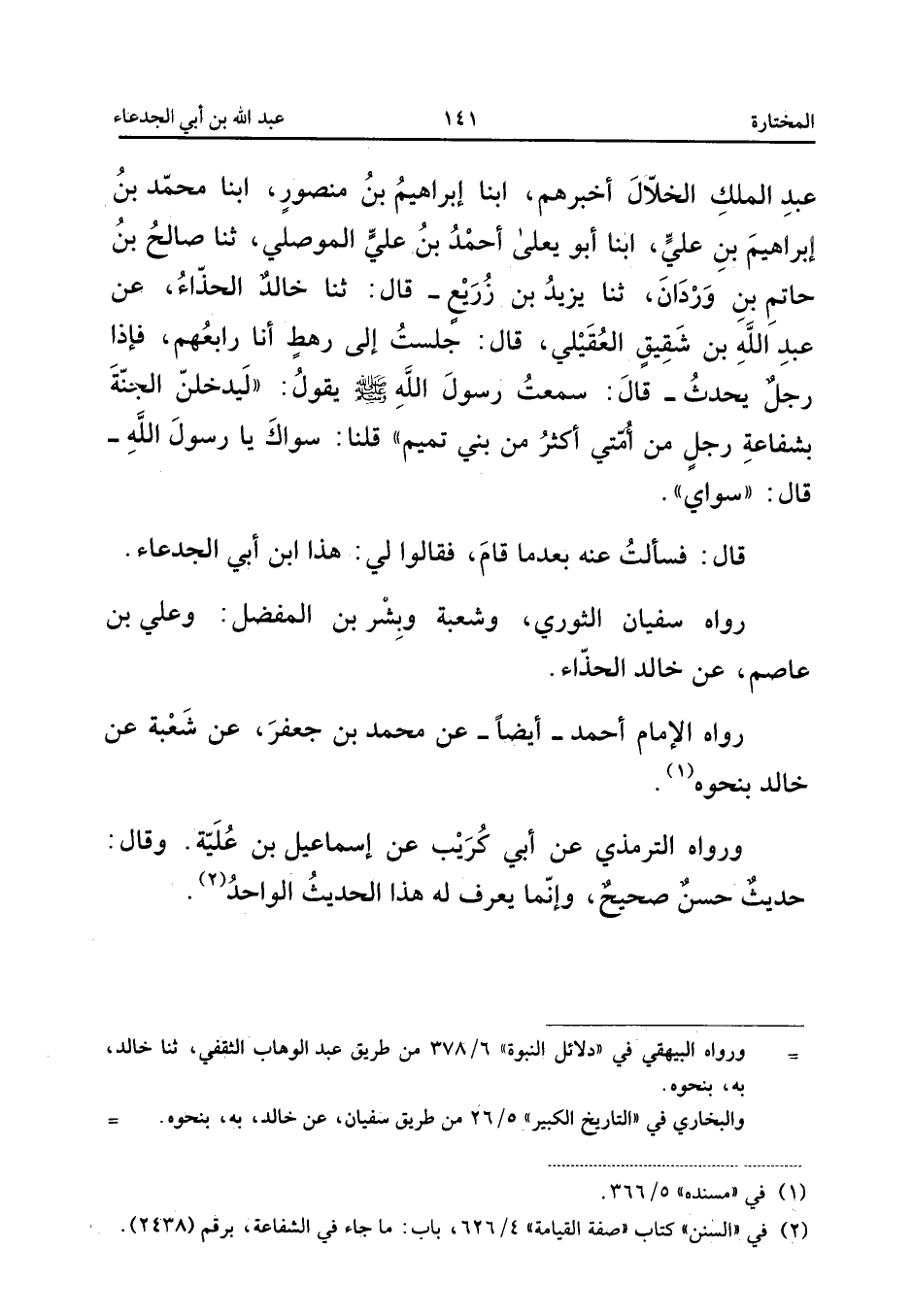 رَوَاهُ سُفْيَانُ الثَّوْرِيُّ وَشُعْبَةُ وَبِشْرُ بْنُ الْمُفَضَّلِ وَعَلِيُّ بْنُ عَاصِمٍ عَنْ خَالِدٍ الْحَذَّاءِ رَوَاهُ الإِمَامُ أَحْمَدُ أَيْضًا عَنْ مُحَمَّدِ بْنِ جَعْفَرٍ عَنْ شُعْبَةَ عَنْ خَالِدٍ بِنَحْوِهِ وَرَوَاهُ التِّرْمِذِيّ عَن أبي كريب عَن اسماعيل بن عُلَيَّةَ وَقَالَ حَدِيثٌ حَسَنٌ صَحِيحٌ وَإِنَّمَا يُعْرَفُ لَهُ هَذَا الحَدِيث الْوَاحِد