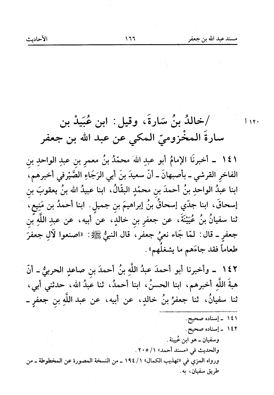 142 - وَأَخْبَرَنَا أَبُو أَحْمَدَ عَبْدُ اللَّهِ بْنُ أَحْمَدَ بْنِ صَاعِدٍ الْحَرْبِيُّ أَنَّ هِبَةَ اللَّهِ أَخْبَرَهُمْ أبنا الْحَسَنُ أبنا أَحْمَدُ ثَنَا عَبْدُ اللَّهِ حَدَّثَنِي أَبِي ثَنَا سُفْيَانُ ثَنَا جَعْفَرُ بْنُ خَالِدٍ عَنْ أَبِيهِ عَنْ عَبْدِ اللَّهِ بْنِ جَعْفَرٍ قَالَ لَمَّا جَاءَ نَعْيُ جَعْفَرٍ حِينَ قُتِلَ قَالَ النَّبِي ص
