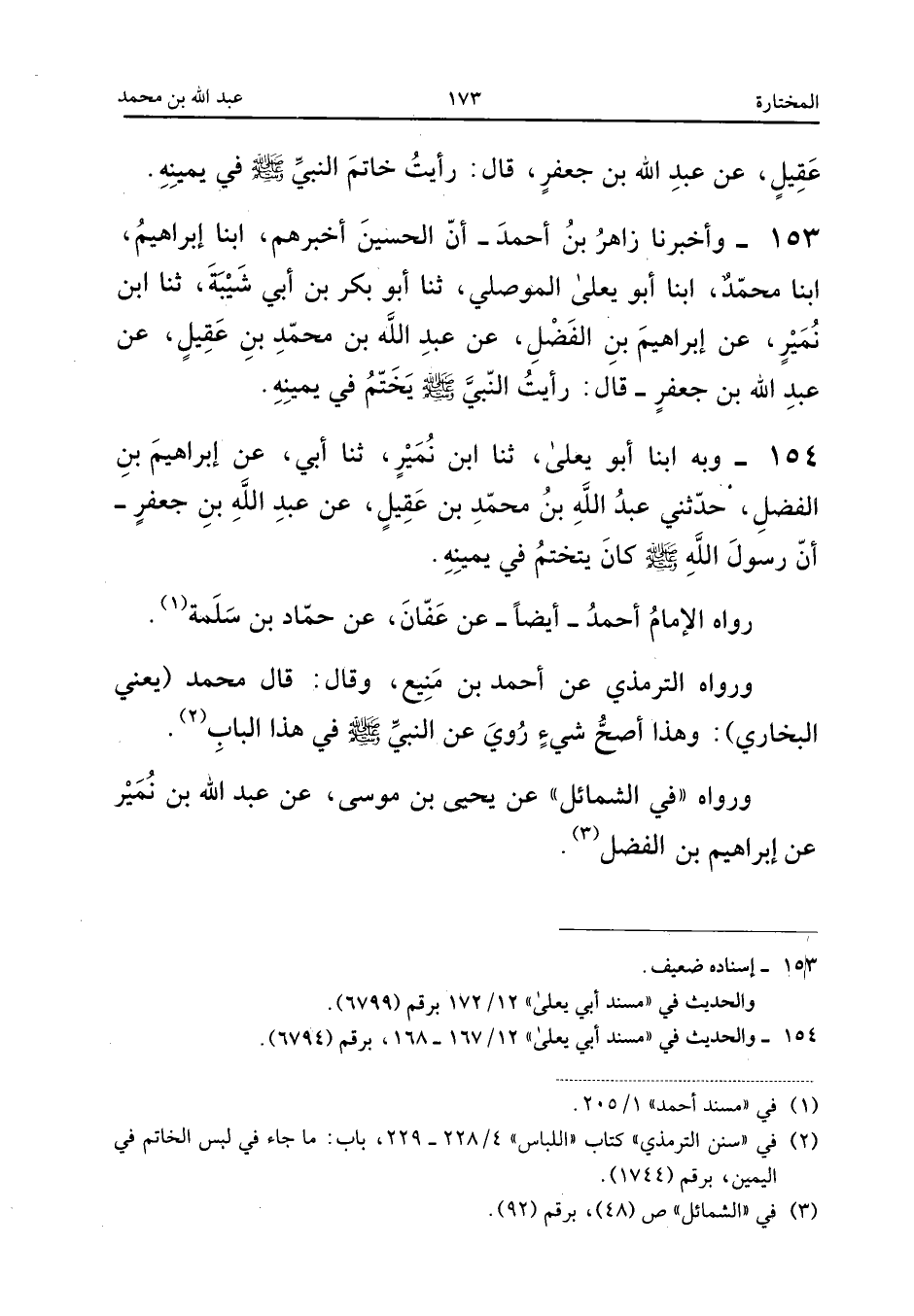 154 - وَبِهِ أبنا أَبُو يَعْلَى ثَنَا ابْنُ نُمَيْرٍ ثَنَا أَبِي عَنْ إِبْرَاهِيمَ بْنِ الْفَضْلِ حَدَّثَنِي عَبْدُ اللَّهِ بْنُ مُحَمَّدِ بْنِ عَقِيلٍ عَنْ عَبْدِ اللَّهِ بْنِ جَعْفَرٍ أَنَّ رَسُولَ اللَّهِ صَلَّى اللَّهُ عَلَيْهِ وَسَلَّمَ كَانَ يَتَخَتَّمُ فِي يَمِينِهِ