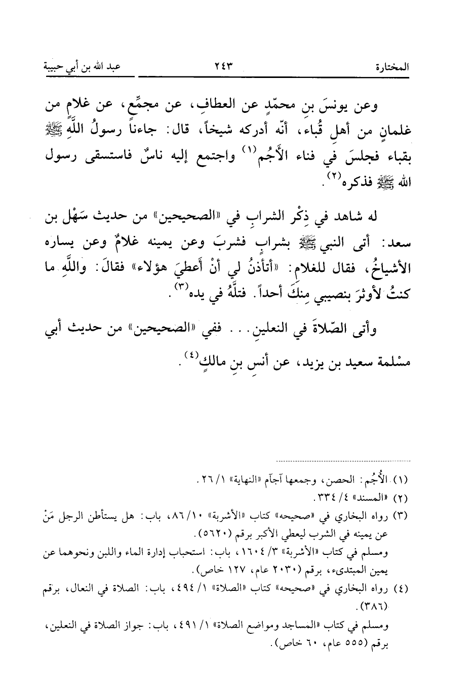 وَعَنْ يُونُسَ بْنِ مُحَمَّدٍ عَنِ الْعَطَّافِ عَنْ مُجَمِّعٍ عَنْ غُلامٍ مِنْ غِلْمَانٍ مِنْ أَهْلِ قُبَاءٍ أَنَّهُ أَدْرَكَهُ شَيْخًا قَالَ جَاءَنَا رَسُولُ اللَّهِ صَلَّى اللَّهُ عَلَيْهِ وَسَلَّمَ بِقُبَاءٍ فَجَلَسَ فِي فِنَاءِ الأَجَمِ وَاجْتَمَعَ إِلَيْهِ نَاسٌ فَاسْتَسْقَى رَسُولُ اللَّهِ صَلَّى اللَّهُ عَلَيْهِ وَسَلَّمَ فَذَكَرَهُ لَهُ شَاهِدٌ فِي ذِكْرِ الشَّرَابِ فِي الصَّحِيحَيْنِ مِنْ حَدِيثِ سَهْلِ بْنِ سَعْدٍ أُتِيَ النَّبِيُّ صَلَّى اللَّهُ عَلَيْهِ وَسَلَّمَ بِشَرَابٍ فَشَرِبَ وَعَنْ يَمِينِهِ غُلامٌ وَعَنْ يَسَارِهِ الأَشْيَاخُ فَقَالَ لِلْغُلامِ أَتَأْذَنُ لِي أَنْ أُعْطِيَ هَؤُلاءِ فَقَالَ وَاللَّهِ مَا كُنْتُ لأُوثِرَ بِنَصِيبِي مِنْكَ أَحَدًا فَتَلَّهُ فِي يَدِهِ وَأَتَى الصَّلاةَ فِي النَّعْلَيْنِ
