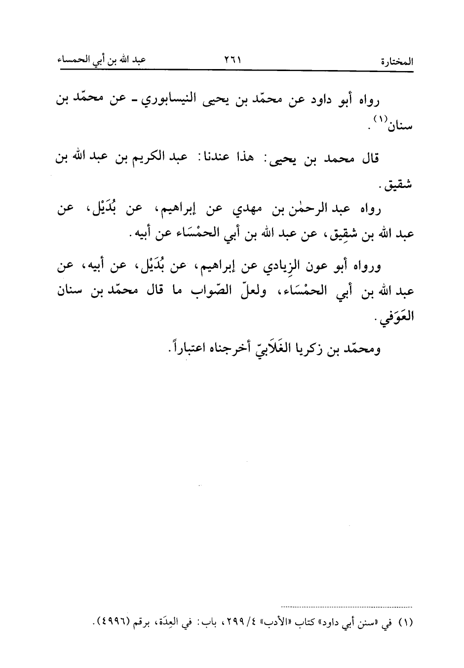 رَوَاهُ أَبُو دَاوُدَ عَنْ مُحَمَّدِ بْنِ يَحْيَى النَّيْسَابُورِيِّ عَنْ مُحَمَّدِ بْنِ سِنَانٍ قَالَ مُحَمَّدُ بْنُ يَحْيَى هَذَا عِنْدَنَا عَبْدُ الْكَرِيمِ بْنُ عَبْدِ اللَّهِ بْنِ شَقِيقٍ رَوَاهُ عَبْدُ الرَّحْمَنِ بْنُ مَهْدِيٍّ عَنْ إِبْرَاهِيمَ عَنْ بُدَيْلٍ عَنْ عَبْدِ اللَّهِ بْنِ شَقِيقٍ عَنْ عَبْدِ اللَّهِ بْنِ أَبِي الْحَمْسَاءِ عَنْ أَبِيهِ وَرَوَاهُ أَبُو عَوْنٍ الزِّيَادِيُّ عَنْ إِبْرَاهِيمَ عَنْ بُدَيْلٍ عَنْ أَبِيهِ عَنْ عَبْدِ اللَّهِ بْنِ أَبِي الْحَمْسَاءِ وَلَعَلَّ الصَّوَابُ مَا قَالَ مُحَمَّدُ بْنُ سِنَانٍ الْعَوْفِيُّ وَمُحَمَّدُ بْنُ زَكَرِيَّا الْغَلابِيُّ أَخْرَجْنَاهُ اعْتِبَارًا