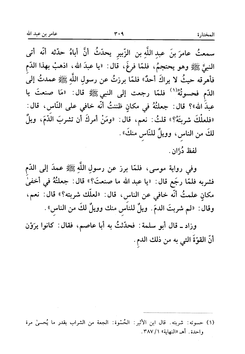 لَفْظُ دُرَّانَ وَفِي رِوَايَةِ مُوسَى فَلَمَّا بَرَزَ عَنْ رَسُولِ اللَّهِ صَلَّى اللَّهُ عَلَيْهِ وَسَلَّمَ عَمَدَ إِلَى الدَّمِ فَشَرِبَهُ فَلَمَّا رَجَعَ قَالَ يَا عَبْدَ اللَّهِ مَا صَنَعْتَ قَالَ جَعَلْتُهُ فِي أخْفى مَكَان علمت أَنه خافي عَنِ النَّاسِ قَالَ لَعَلَّكَ شَرِبْتَهُ قَالَ نَعَمْ وَقَالَ لِمَ شَرِبْتَ الدَّمَ وَيْلٌ لِلنَّاسِ مِنْكَ وَوَيْلٌ لَكَ مِنَ النَّاسِ وَزَادَ قَالَ أَبُو سَلمَة فَحدثت بِهِ أَبَا عَاصِم فَقَالَ كانو يَرَوْنَ أَنَّ الْقُوَّةَ الَّتِي بِهِ مِنْ ذَلِكَ الدَّم