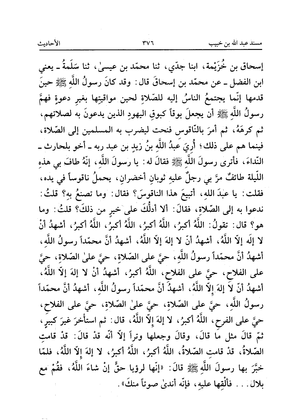 حِينَ قَدِمَهَا إِنَّمَا يَجْتَمِعُ النَّاسُ إِلَيْهِ لِلصَّلاةِ لِحِينِ مَوَاقِيتِهَا بِغَيْرِ دَعْوَةٍ فَهَمَّ رَسُولُ اللَّهِ صَلَّى اللَّهُ عَلَيْهِ وَسَلَّمَ أَنْ يَجْعَلَ بُوقًا كَبُوقِ الْيَهُودِ الَّذِينَ يَدْعُونَ بِهِ لِصَلاتِهِمْ ثُمَّ كَرِهَهُ ثُمَّ أَمَرَ بِالنَّاقُوسِ فَنُحِتَ لِيَضْرِبَ بِهِ الْمُسلمين الى الصَّلَاة فينما هُمْ عَلَى ذَلِكَ أُرِيَ عَبْدُ اللَّهِ بْنُ زَيْدِ بْنِ عَبْدِ رَبِّهِ أَخُو بَلْحَارِثٍ النِّدَاءَ فأترى رَسُولِ اللَّهِ صَلَّى اللَّهُ عَلَيْهِ وَسَلَّمَ فَقَالَ لَهُ يَا رَسُولَ اللَّهِ إِنَّهُ طَافَ بِي هَذِه الله طَائِفٌ مَرَّ بِي رَجُلٌ عَلَيْهِ ثَوْبَانِ أَخْضَرَانِ يَحْمِلُ نَاقُوسًا فِي يَدِهِ فَقُلْتُ يَا عَبْدَ اللَّهِ أَتَبِيعُ هَذَا النَّاقُوسَ فَقَالَ وَمَا تَصْنَعُ بِهِ قلت ندعوا بِهِ إِلَى الصَّلاةِ فَقَالَ أَلا أَدُلُّكَ عَلَى خَيْرٍ مِنْ ذَلِكَ قُلْتُ وَمَا هُوَ قَالَ تَقُولُ اللَّهُ أَكْبَرُ اللَّهُ أَكْبَرُ اللَّهُ أَكْبَرُ الله أكبر أشهد ان لااله إِلا اللَّهُ أَشْهَدُ أَنَّ لَا إِلَهَ إِلا اللَّهُ أَشْهَدُ أَنَّ مُحَمَّدًا رَسُولُ اللَّهِ أَشْهَدُ أَنَّ مُحَمَّدًا رَسُولُ اللَّهِ حَيَّ عَلَى الصَّلاةِ حَيَّ عَلَى الصَّلاةِ حَيَّ عَلَى الْفَلاحِ حَيَّ على الْفَلاح اللَّهُ أَكْبَرُ أَشْهَدُ أَنَّ لَا إِلَهَ إِلا اللَّهُ أَشْهَدُ أَنَّ لَا إِلَهَ إِلا اللَّهُ أَشْهَدُ أَنَّ مُحَمَّدًا رَسُولُ اللَّهِ أَشْهَدُ أَنَّ مُحَمَّدًا رَسُولُ اللَّهِ حَيَّ عَلَى الصَّلاةِ حَيَّ عَلَى الصَّلاةِ حَيَّ عَلَى الْفَلاحِ حَيَّ عَلَى الْفَلاح اللَّهُ أَكْبَرُ لَا إِلَهَ إِلا اللَّهُ قَالَ ثُمَّ اسْتَأْخَرَ غَيْرَ كَبِيرٍ ثُمَّ قَالَ مِثْلَ مَا قَالَ وَقَالَ وَجَعَلَهَا وِتْرًا إِلا أَنَّهُ قَدْ قَالَ قَدْ قَامَتِ الصَّلاةُ قَدْ قَامَتِ الصَّلاةُ اللَّهُ أَكْبَرُ اللَّهُ أَكْبَرُ لَا إِلَهَ إِلا اللَّهُ فَلَمَّا خَبَّرَ بِهَا رَسُولَ اللَّهِ صَلَّى اللَّهُ عَلَيْهِ وَسَلَّمَ قَالَ إِنَّهَا لَرُؤْيَا حَقٌّ إِنْ شَاءَ اللَّهِ فَقُمْ مَعَ بِلالٍ فَأَلْقِهَا عَلَيْهِ فَإِنَّهُ أَنْدَى صَوْتًا مِنْكَ