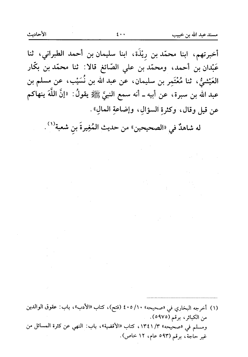 أَخْبَرَتْهُمْ أبنا مُحَمَّدُ بْنُ رِيذَةَ أبنا سُلَيْمَانُ بن أَحْمد الطَّبَرَانِيّ ثَنَا ع عَبْدَانُ بْنُ أَحْمَدَ وَمُحَمَّدُ بْنُ عَلِيٍّ الصَّائِغُ قَالا ثَنَا مُحَمَّدُ بْنُ بَكَّارٍ الْعَيْشِيُّ ثَنَا مُعْتَمِرُ بْنُ سُلَيْمَانَ عَنْ عَبْدِ اللَّهِ بْنِ نُسَيْبٍ عَنْ مُسْلِمِ بْنِ عَبْدِ اللَّهِ بْنِ سَبْرَةَ عَنْ أَبِيهِ أَنَّهُ سَمِعَ النَّبِيَّ صَلَّى اللَّهُ عَلَيْهِ وَسَلَّمَ يَقُولُ إِنَّ اللَّهَ يَنْهَاكُمْ عَنْ قِيلَ وَقَالَ وَكَثْرَةِ السُّؤَالِ وَإِضَاعَةِ الْمَالِ