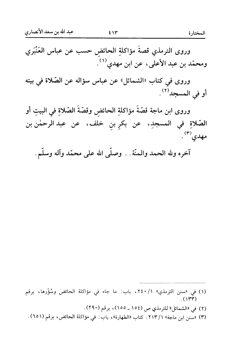 وَرَوَى التِّرْمِذِيُّ قِصَّةَ مُؤَاكَلَةِ الْحَائِضِ حَسْبُ عَنْ عَبَّاسٍ الْعَنْبَرِيِّ وَمُحَمَّدِ بْنِ عَبْدِ الأَعْلَى عَنِ ابْنِ مَهْدِيٍّ وَرَوَى فِي كِتَابِ الشَّمَائِلِ عَنْ عَبَّاسٍ سُؤَالَهُ عَنِ الصَّلاةِ فِي بَيْتِهِ أَوْ فِي الْمَسْجِدِ وَرَوَى ابْنُ مَاجَهْ قِصَّةَ مُؤَاكَلَةِ الْحَائِضِ وَقِصَّةَ الصَّلاةِ فِي الْبَيْتِ أَوِ الصَّلاةِ فِي الْمَسْجِدِ عَنْ بَكْرِ بْنِ خَلَفٍ عَنْ عَبْدِ الرَّحْمَنِ بْنِ مَهْدِيٍّ آخِرُهُ وَللَّهِ الْحَمْدُ وَالْمِنَّةُ وَصَلَّى اللَّهُ عَلَى مُحَمَّدٍ وَآلِهِ وَسَلَّمَ