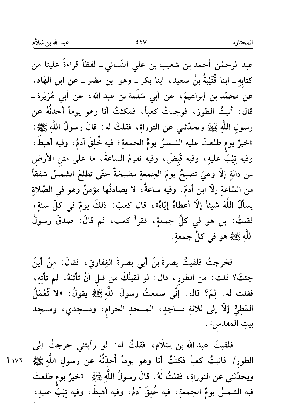 عَبْدِ الرَّحْمَنِ أَحْمَدُ بْنُ شُعَيْبِ بْنِ عَلِيٍّ النَّسَائِيُّ لَفْظًا قِرَاءَةً عَلَيْنَا مِنْ كِتَابِهِ أبنا قُتَيْبَةُ بْنُ سَعِيدٍ أبنا بَكْرٌ وَهُوَ ابْنُ مُضَرَ عَنِ ابْنِ الْهَادِ عَنْ مُحَمَّدِ بْنِ إِبْرَاهِيمَ عَنْ أَبِي سَلَمَةَ بْنِ عَبْدِ اللَّهِ عَنْ أَبِي هُرَيْرَةَ قَالَ أَتَيْتُ الطُّورَ فَوَجَدْتُ كَعْبًا فَمَكَثْتُ أَنَا وَهُوَ يَوْمًا أُحَدِّثُهُ عَنْ رَسُولِ اللَّهِ صَلَّى اللَّهُ عَلَيْهِ وَسَلَّمَ وَيُحَدِّثُنِي عَنِ التَّوْرَاةِ فَقُلْتُ لَهُ قَالَ رَسُولُ اللَّهِ صَلَّى اللَّهُ عَلَيْهِ وَسَلَّمَ خَيْرُ يَوْمٍ طَلَعَتْ عَلَيْهِ الشَّمْسُ يَوْمُ الْجُمُعَةِ فِيهِ خُلِقَ آدَمُ وَفِيهِ أُهْبِطَ وَفِيهِ تِيبَ عَلَيْهِ وَفِيهِ قُبِضَ وَفِيهِ تَقُومُ السَّاعَةُ مَا عَلَى مَتْنِ الأَرْضِ مِنْ دَابَّةٍ إِلا وَهِيَ تُصْبِحُ يَوْمَ الْجُمُعَةِ مضيخة حَتَّى تَطْلُعَ الشَّمْسُ شَفَقًا مِنَ السَّاعَةِ إِلا ابْنَ آدَمَ وَفِيهِ سَاعَةٌ لَا يُصَادِفُهَا مُؤْمِنٌ وَهُوَ فِي الصَّلاةِ يَسْأَلُ اللَّهَ شَيْئًا إِلا أَعْطَاهُ إِيَّاهُ قَالَ كَعْبٌ ذَلِكَ يَوْمٌ فِي كُلِّ سَنَةٍ فَقُلْتُ بَلْ هُوَ فِي كُلِّ جُمُعَةٍ فَقَرَأَ كَعْبٌ ثُمَّ قَالَ صَدَقَ رَسُولُ اللَّهِ صَلَّى اللَّهُ عَلَيْهِ وَسَلَّمَ هُوَ فِي كُلِّ جُمُعَةٍ فَخَرَجْتُ فَلَقِيتُ بَصْرَةَ بْنَ أَبِي بَصْرَةَ الْغِفَارِيَّ فَقَالَ مِنْ أَيْنَ جِئْتَ قُلْتُ مِنَ الطُّورِ قَالَ لَوْ لَقِيتُكَ مِنْ قَبْلِ أَنْ تَأْتِيَهُ لَمْ تَأْتِهِ فَقُلْتُ لَهُ لِمَ قَالَ إِنِّي سَمِعْتُ رَسُولَ اللَّهِ صَلَّى اللَّهُ عَلَيْهِ وَسَلَّمَ يَقُولُ لَا تُعْمَلُ الْمَطِيُّ إِلا إِلَى ثَلاثَةِ مَسَاجِدَ الْمَسْجِدِ الْحَرَامِ وَمَسْجِدِي وَمَسْجِدِ بَيْتِ الْمَقْدِسِ فَلَقِيتُ عَبْدَ اللَّهِ بْنَ سَلامٍ فَقُلْتُ لَهُ لَوْ رَأَيْتَنِي خَرَجْتُ إِلَى الطُّورِ فَأَتَيْتُ كَعْبًا فَكُنْتُ أَنَا وَهُوَ يَوْمًا أُحَدِّثُهُ عَنْ رَسُولِ اللَّهِ صَلَّى اللَّهُ عَلَيْهِ وَسَلَّمَ وَيُحَدِّثُنِي عَنِ التَّوْرَاةِ فَقُلْتُ لَهُ قَالَ رَسُولُ اللَّهِ صَلَّى اللَّهُ عَلَيْهِ وَسَلَّمَ خَيْرُ يَوْمٍ طَلَعَتْ فِيهِ الشَّمْسُ يَوْمُ الْجُمُعَةِ فِيهِ خُلِقَ آدَمُ وَفِيهِ أُهْبِطَ وَفِيهِ تِيبَ عَلَيْهِ