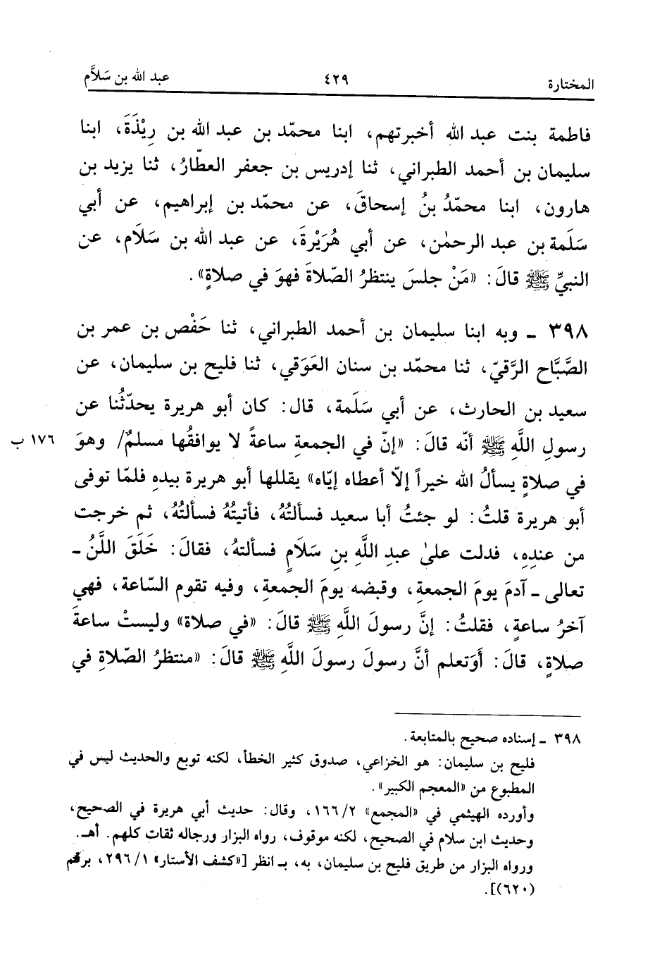 398 - وَبِهِ أبنا سُلَيْمَانُ بْنُ أَحْمَدَ الطَّبَرَانِيُّ ثَنَا حَفْصُ بْنُ عُمَرَ بْنِ الصَّبَّاحِ الرَّقِّيُّ ثَنَا مُحَمَّدُ بْنُ سِنَانٍ الْعَوْقِيُّ ثَنَا فُلَيْحُ بْنُ سُلَيْمَانَ عَنْ سَعِيدِ بْنِ الْحَارِثِ عَنْ أَبِي سَلَمَةَ قَالَ كَانَ أَبُو هُرَيْرَةَ يُحَدِّثُنَا عَنْ رَسُولِ اللَّهِ صَلَّى اللَّهُ عَلَيْهِ وَسَلَّمَ أَنَّهُ قَالَ إِنَّ فِي الْجُمُعَةِ سَاعَةً لَا يُوَافِقُهَا مُسْلِمٌ وَهُوَ فِي صَلاةٍ يَسْأَلُ اللَّهَ خَيْرًا إِلا أَعْطَاهُ إِيَّاهُ يُقَلِّلُهَا أَبُو هُرَيْرَةَ بِيَدِهِ فَلَمَّا تُوُفِّيَ أَبُو هُرَيْرَةَ قُلْتُ لَوْ جِئْتَ أَبَا سَعِيدٍ فَسَأَلْتَهُ فَأَتَيْتُهُ فَسَأَلْتُهُ ثُمَّ خَرَجْتُ مِنْ عِنْدِهِ فَدُلْتُ عَلَى عَبْدِ اللَّهِ بْنِ سَلامٍ فَسَأَلْتُهُ فَقَالَ خَلَقَ اللَّهُ تَعَالَى آدَمَ يَوْمَ الْجُمُعَةِ وَقَبَضَهُ يَوْمَ الْجُمُعَةِ وَفِيهِ تَقُومُ السَّاعَةُ فَهِيَ آخِرُ سَاعَةٍ فَقُلْتُ إِنَّ رَسُولَ اللَّهِ صَلَّى اللَّهُ عَلَيْهِ وَسَلَّمَ قَالَ فِي صَلاةٍ وَلَيْسَتْ سَاعَةَ صَلاةٍ قَالَ أَوَتَعْلَمُ أَن رَسُولُ رَسُولِ اللَّهِ صَلَّى اللَّهُ عَلَيْهِ وَسَلَّمَ قَالَ مُنْتَظِرُ الصَّلاةِ فِي